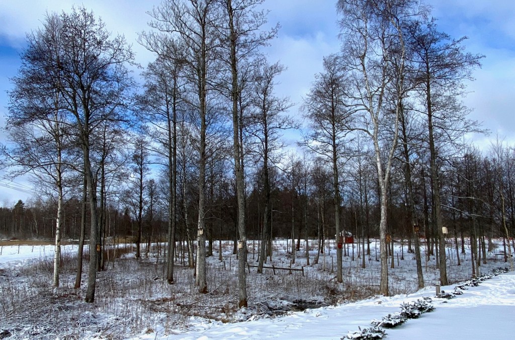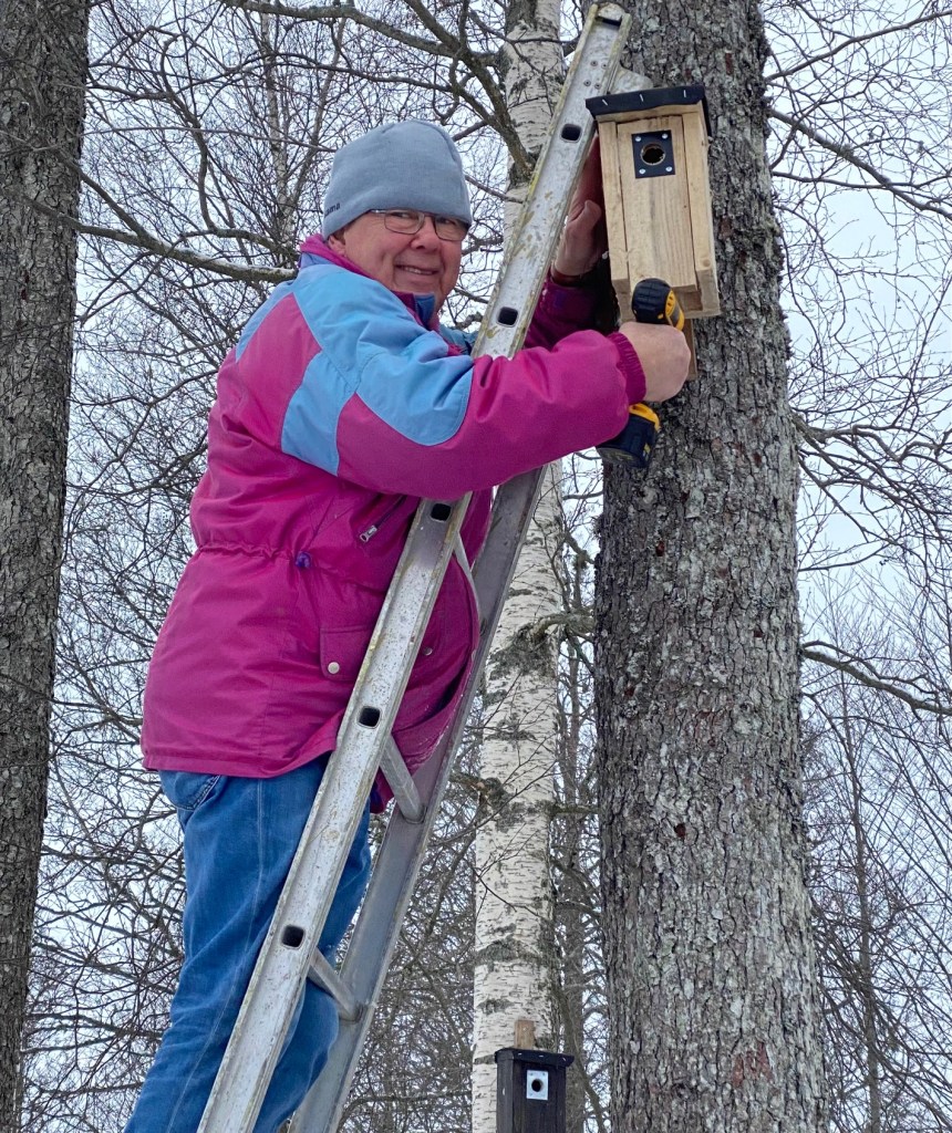 På våren mötts vi av en överväldigande fågelsång på mornarna när vi kommer ut. Nu måste vi betala tillbaka! Sedan tidigare har jag fått ”bygglov” för att sätta upp holkar i kommunens träd. Idag var det dags att ge våra fåglar husrum. Marken består av våtmark, det var -4 och svinkallt, 10 cm nysnö, svårt att ha handskar på sig, stegen var iskall, nageltrång i fingrarna och stegar är inget bra för mig längre på ett ostadigt underlag. Dessutom var barken på vissa träd för tjock, skruvarna för korta och ”bitsen” passade inte trots 3 olika sortiment askar. Till slut var vi klara.