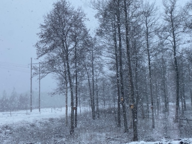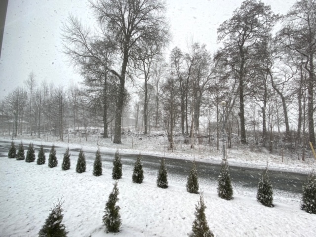 Likadant väder här och nu har det börjat snöa igen. Det lockar inte att åka iväg, det får vänta. Och eftersom Jakob fortfarande har ont efter sitt fall, blir det väldigt lätt att bestämma att vi ska vara hemma. Tids nog kommer Våren.