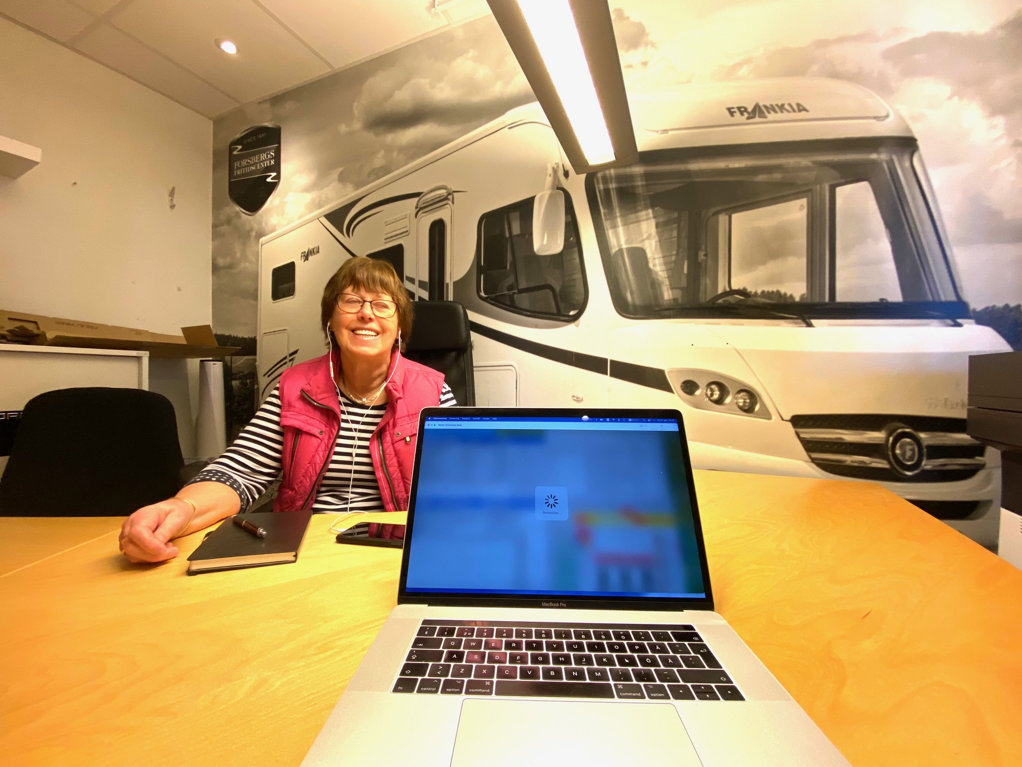 Birgitta gick upp och jobbade redan vid 5 tiden på morgonen p.g.a att vi bytte telefonväxel hemma på jobbet kl. 3 på natten. På bilden har vi fått låna ett ledigt säljarkontor på Forsbergs. Hon tog emot alla samtal som kom in och dirigerade dem så gott hon kunde när alla satt i utbildning hemma. En fantastisk teknik …