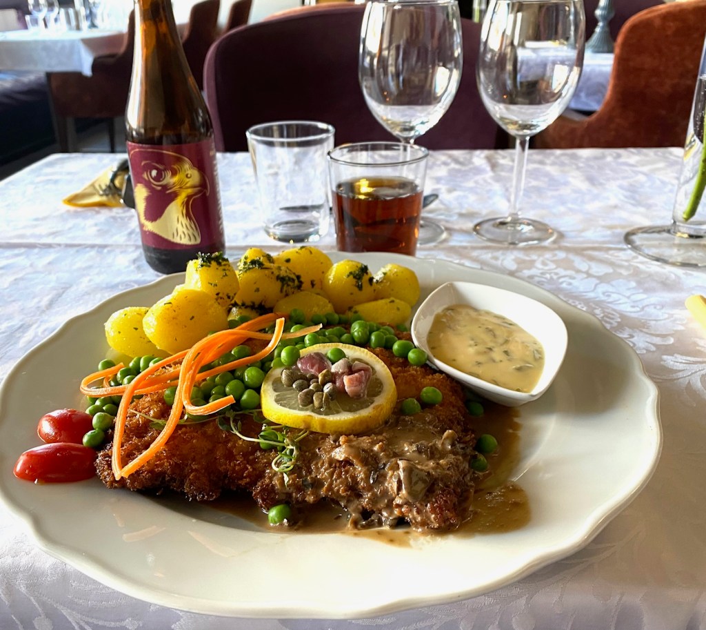 När vi parkerat på ställplatsen bar det iväg till vår stamkrog, som vi besöker 1- 2 gånger om året, Restaurang S2, som ligger i centrum av Kinna. En så god Schnitzel har jag inte ätit sedan jag var på en restaurang i Kitsbühel för15 år sedan. Jag beställde till extra potatis och mycket ärtor som jag älskar.