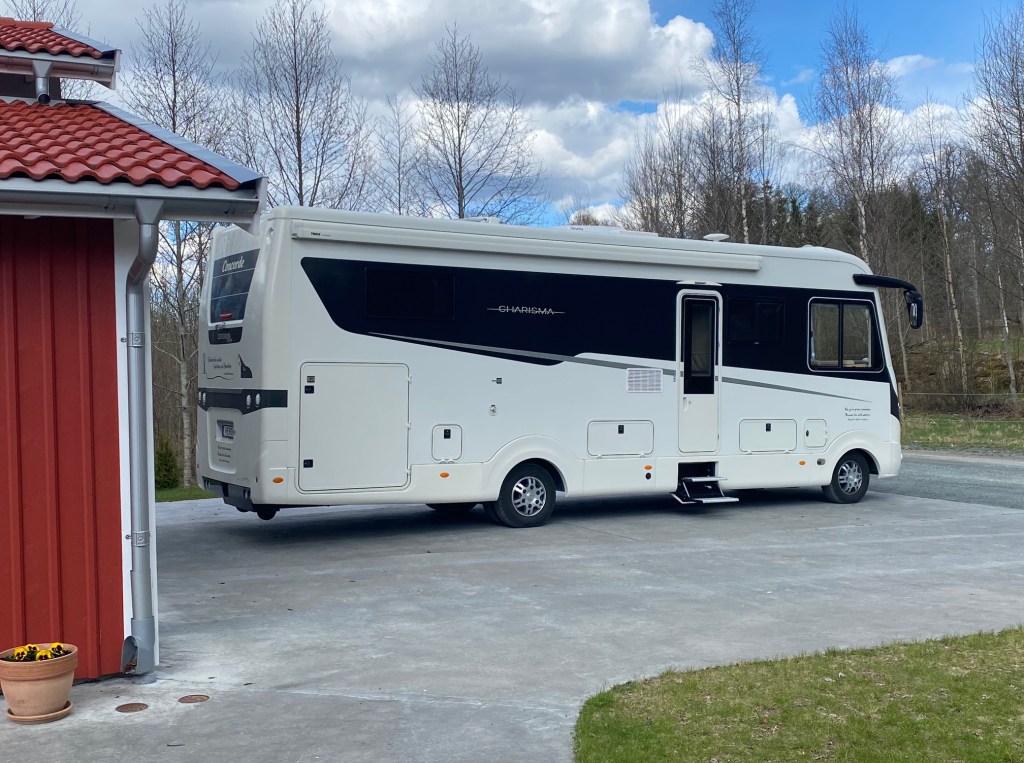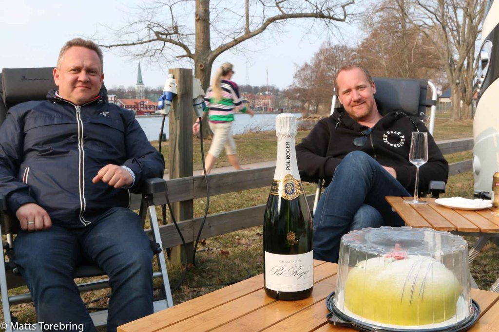 Här satt våra vänner på Södra Hamnens Ställplats i mitten av april månad 2018 och hade slagit vad om att vi hade köpt en ny Concorde. På vägen mellan Mantorp och Vadstena fick vi telefonbeskedet, vårt bud var accepterat, bilen var vår. Tack vänner för alla goda råd på vägen dit.