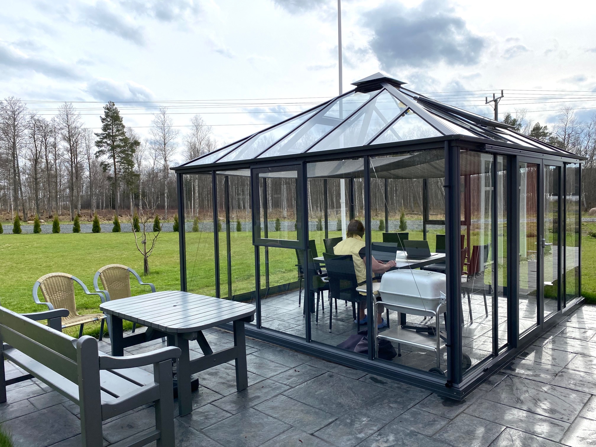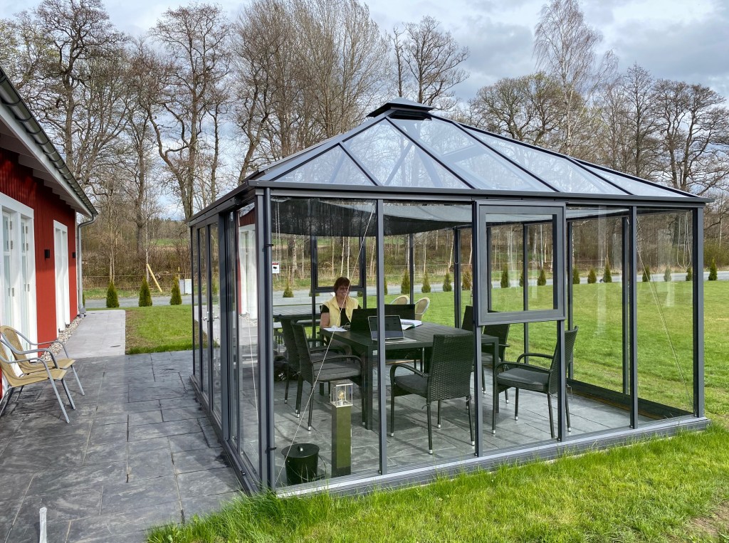 Jag såg henne sitta på kanten till vårt bord och ta fart rakt in i glasväggen. Jag tänkte inte mer på detta. Idag när vi kom hem tog det minst en timma för mig och Birgitta att städa upp. Fågelbajs på stolar och dynor, på glasväggarna och inte minst på golvet. Bordet var som en enda bajsränna.