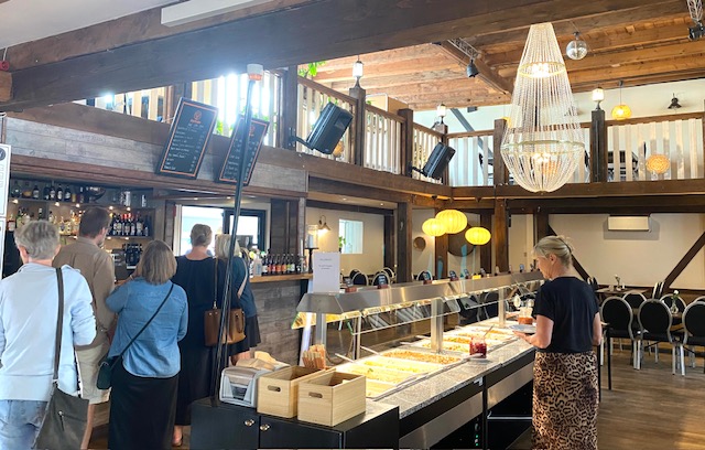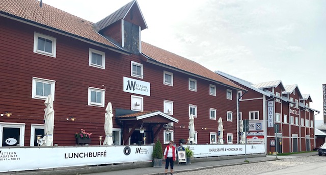 Vi gick in och tittade runt i flera av dem, men fastnade för Wetternmagasinet på sista bilden. Jag är svag för att få äta buffé, samt att få sitta på en uteservering. En fredag som idag höll vi tillgodo med Dagens rätt. Inte nog med god mat, alla gäster bjöds på hembakad och mycket god tårta till kaffet. Motala är en sommarstad och då bör man vara här.