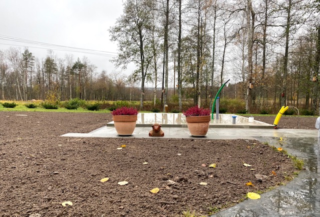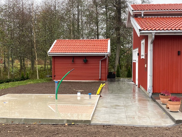 Vår fantastiskt duktige och inte minst trevlige markentreprenör, Oskar Svensson, Entbollaget, Nässjö, ställde av 2 jättestora lösflak med matjord. Sedan körde 2 mindre hjullastare i skytteltrafik över torget och ut till planen runt drängstugan. När jag kom hem från jobbet på eftermiddagen, var hela torget täckt av en smutsig slurk med matjord. Jag visste först inte hur jag skulle kunna komma in i huset.