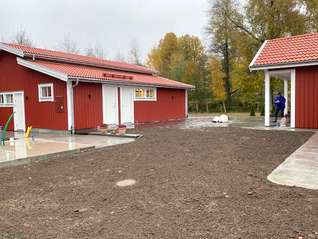 Att gå in i en redan anlagd trädgård, med en grävmaskin och 2 hjullastare skapar stora sår. Nu hoppas vi stället att vi får mycket finare gräsmatta än vad vi hade innan.