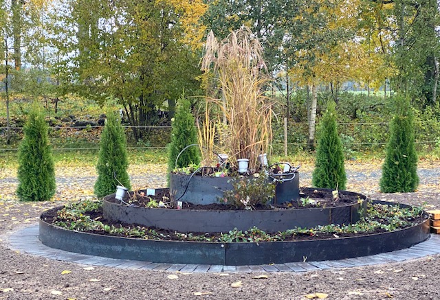 Jag har köpt merparten av mina växter från Eggerts Plantskola i Tyskland samt Spakarps Plantskola, Ingarp, Eksjö. De är båda verkligen proffs och växterna är av högsta kvalité. Lägg märke till utläggningen av markteglet runt rondellen, som kommer från Flisby AB. Det var som så många andra gånger Oskars idé.