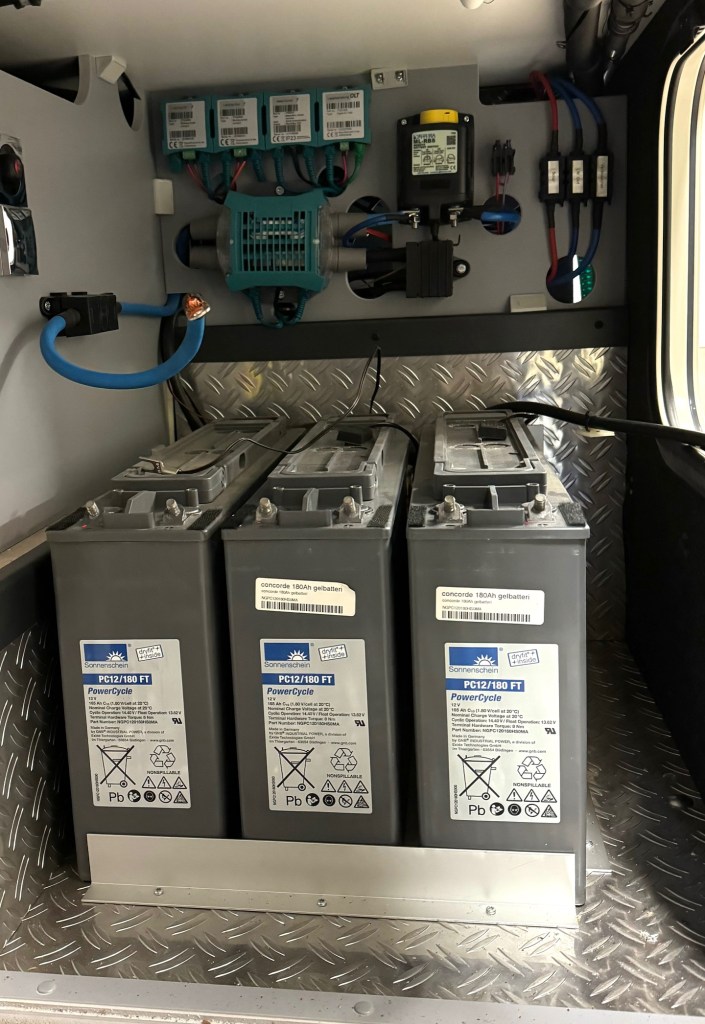 Så här såg våra tidigare batterier ut i bussen, när jag kom till Almenäs Bil i Taberg idag. 3 styck batterier till en hisnande vikt av cirka 50 kg styck, totalt 150 kg.