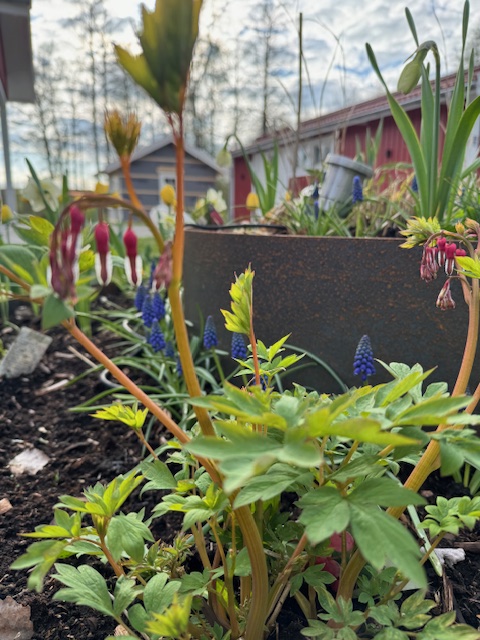 Så fint det är när lökväxterna blommar i trädgårdarna och inte gör det något att det blev mest gula tulpaner, några rosa dök ju upp mot slutet. Huvudsaken är att det blommar och löjtnantshjärta är en riktig favorit ända sedan barndomen.