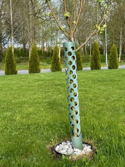 Jag satte skydd runt äppelträdet hos dottern så, men för sent. Men i tid på körsbärsträdet men då bets krona och alla kvistar av och slängdes på marken. Är dovhjortar. Och även rådjur.