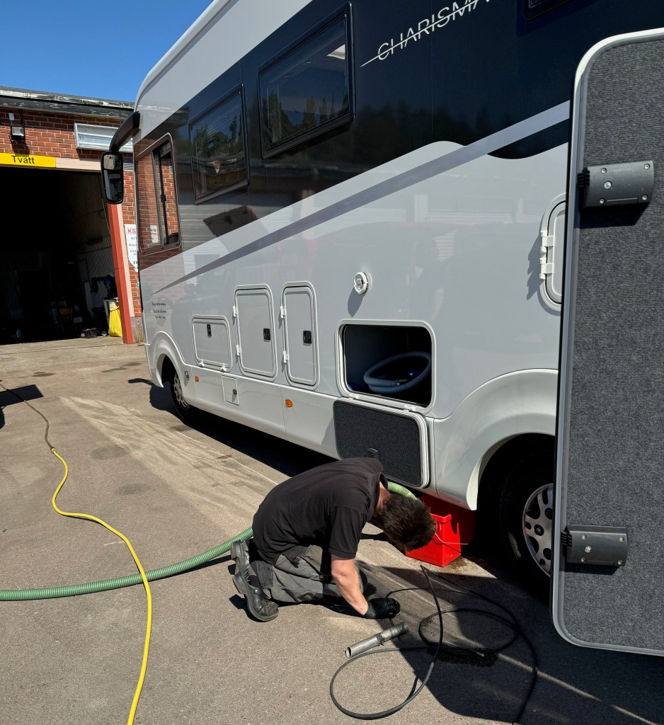 Efter varje resa spolar vi rent i våra svart- & gråvattentankar i bussen. Vi kanske är alldeles för ambitiösa, vi borde lämna lite vatten kvar på botten i tanken. Bussen stod still i mer än ett halvår på grund av sjukdom och kanske fanns det små papperstussar kvar i tanken, som torkade till och gjorde att det blev stopp i avloppet.