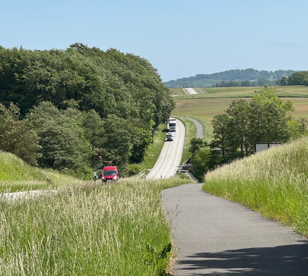 Med cyklarna kommer vi så nära naturen, i motsats till att fara fram i en bil. När det finns så fina cykelbanor som här, då stortrivs vi. Det konstiga med naturen här är alla dessa kullar, dalar och branta backar. Först såg jag lite ängsligt på backarna, men med elcyklarna klarar vi dem på ganska höga växlar. (27 st)