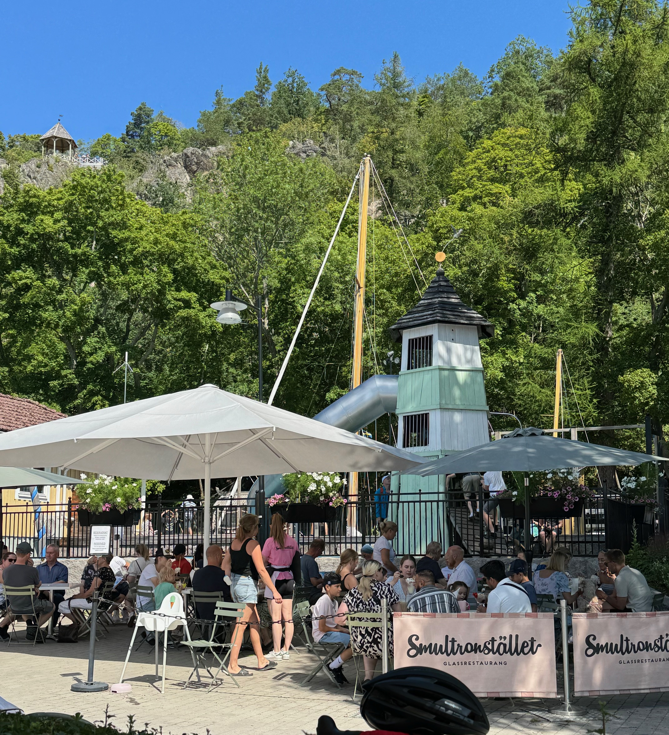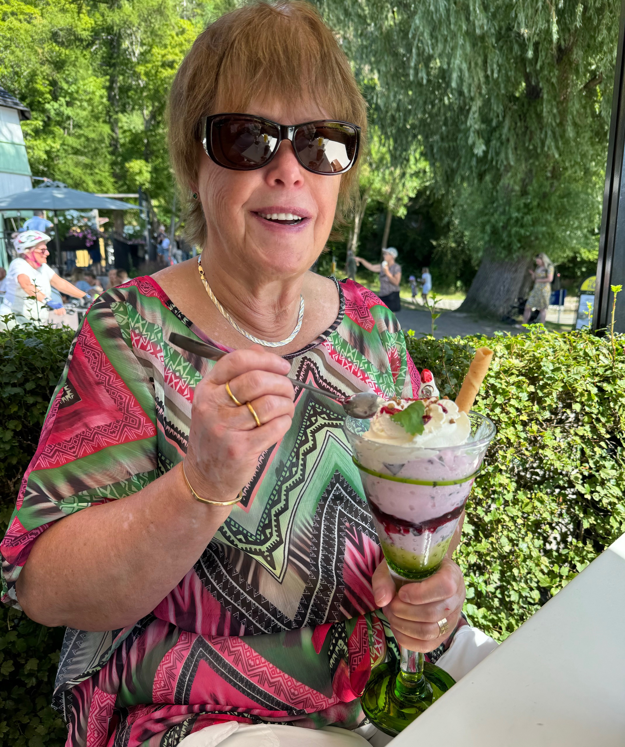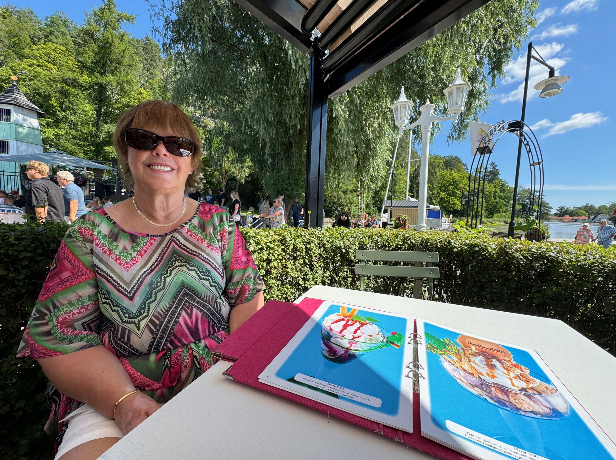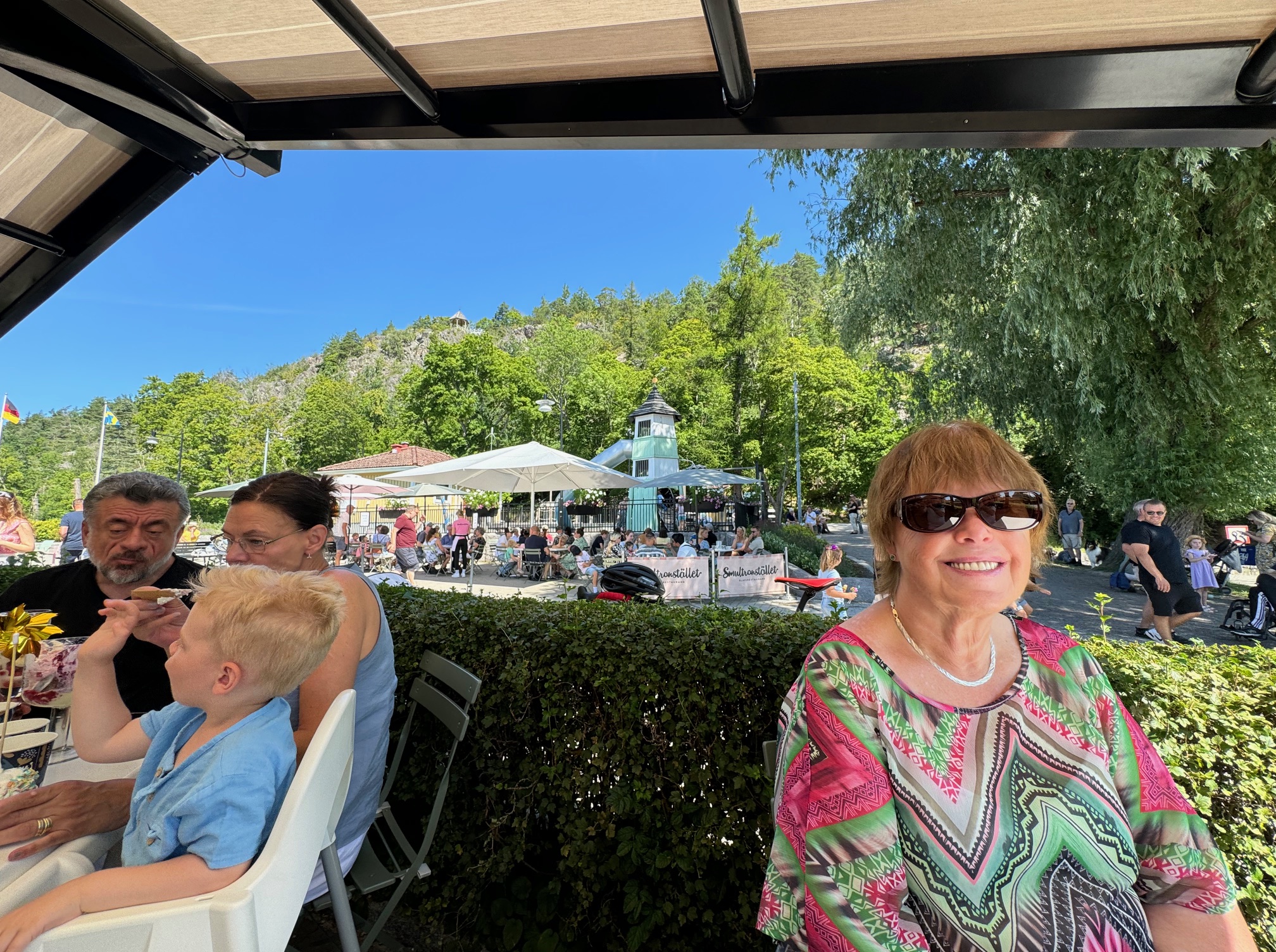 Söderköping är en mysig ställe en sommar stad. Har kusin och kompisar kvar i Söderköping. Smultronstället verkar locka turister, långa köer för att få en sittplats. Men vi är färdiga med det att köa, finns möjlighet att få köpa en strut på sidan av huset. Jag klarar inte längre att stoppa i mig så mycket Glass som dessa menyer erbjuder. Finns ett glass ställe vid Rådhustorget där vi kan stanna till handlar. När vi firade svärfar 90 år bjöd vi med oss barnen till Söderköping och givetvis Smultronstället.