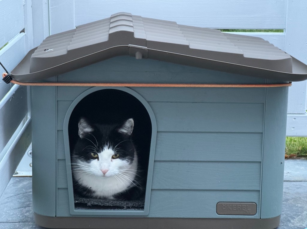 Vår Kissemisse får mat minst en gång om dagen, serverad inne i sin koja för att inte skatorna ska äta upp den. Det tog några veckor, men nu har han flyttat in för gott. Säkert tycker han att det är skönt att sova på liggunderlaget. Trots detta fina boende går han runt vårt hus, kollar i alla våra fönster var vi är, jamar tryckande mot fönsterrutan och vill komma in. Men det får den inte.