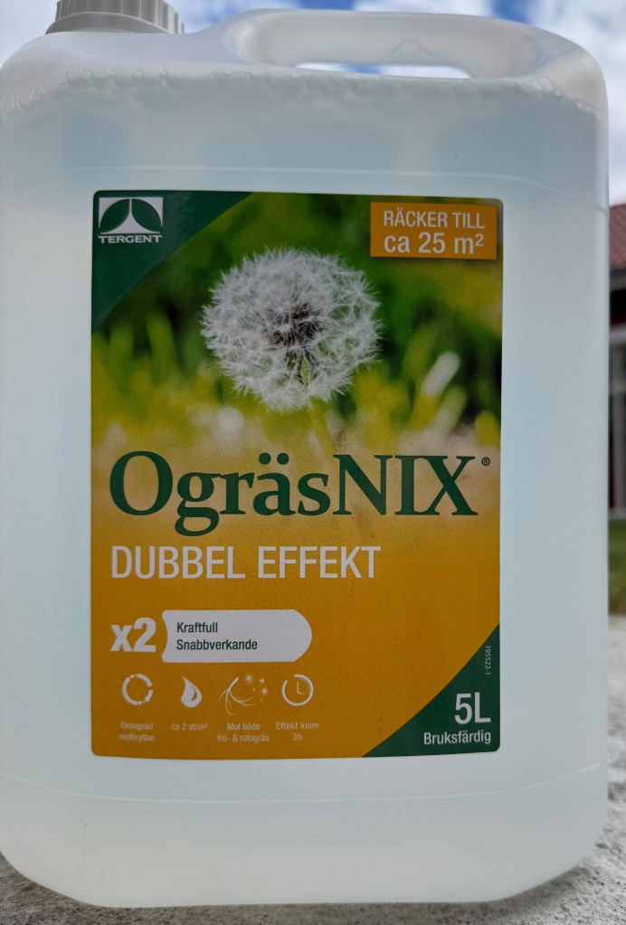 Detta medlet köpte jag på Granngården, ogräsättika med extra tillsats. Jag duschade på maskrosorna för ett par veckor sedan, på bara några timmar var de nedvissnade och idag räfsade jag bara bort dem.