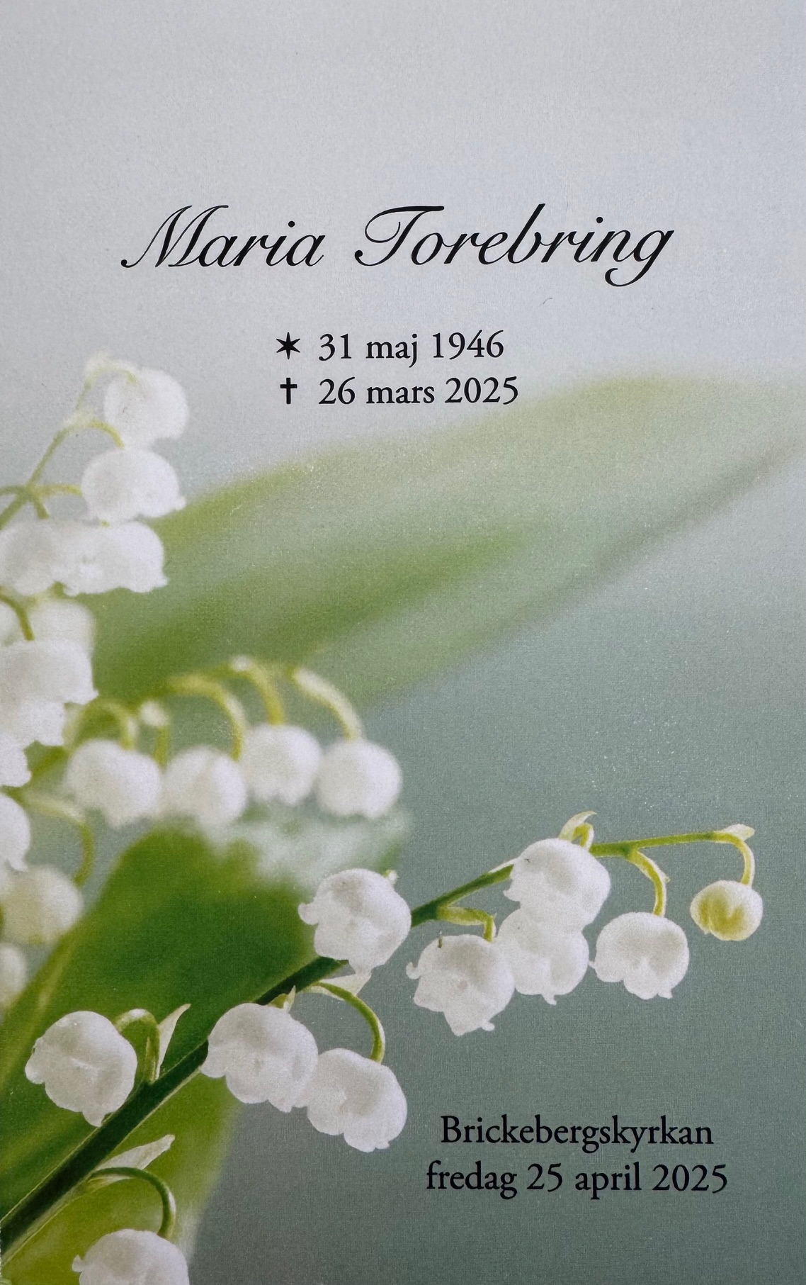 Sedan min bror, din man Rune gick bort, har vi hållit en ömsesidig kontakt. Jag kommer att sakna besöken hos dig när vi passerar Örebro, när du hälsat på oss i Småland och inte minst alla telefonsamtal och SMS. Tack och farväl Maria, men … Vi ses i Himlen …