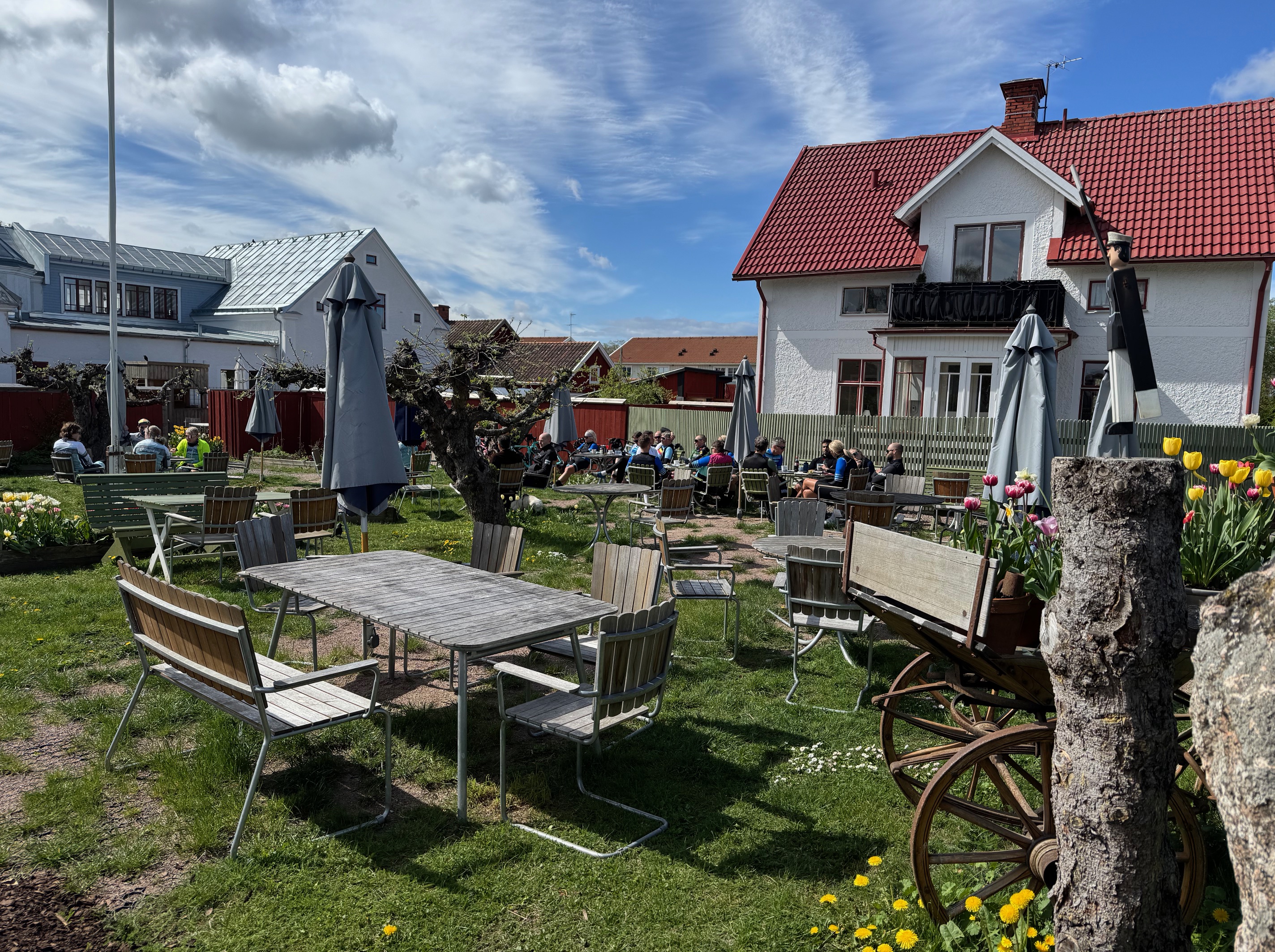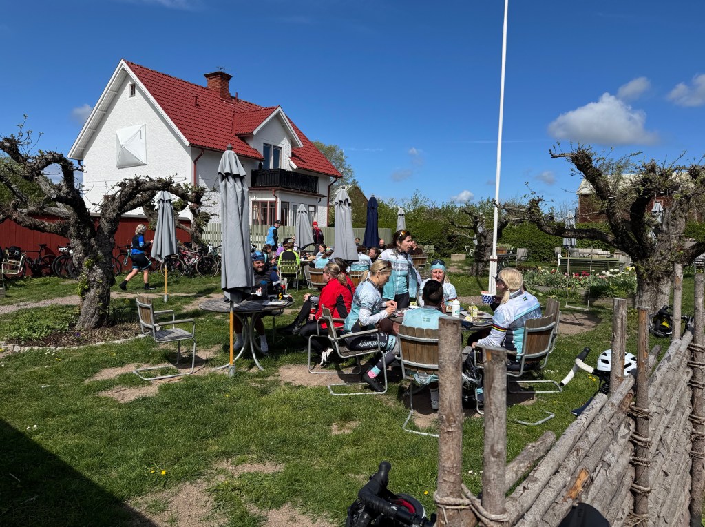 Under den tiden som vi satt där och fikade, kom säkert 4- 5 gäng med många cyklister i varje gäng och tog de sista platserna vid borden ute. 2 personer i kassan, resten av personalen bakar, brygger kaffe, diskar och fyller på. Det går undan …