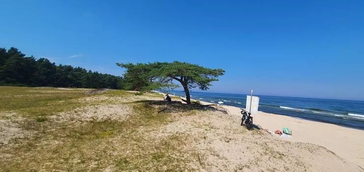 Jag har läst att stranden i Österlen är 7 mil lång, nu väntar den på oss. Varken Birgitta eller jag tål solen. Här finns träd och skugga.