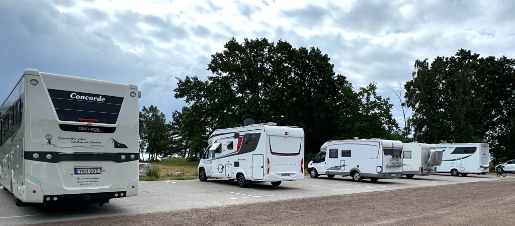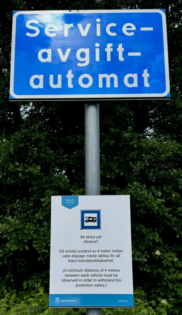 Det har målats upp nya parkeringsrutor och alla följde dem utom en tysk Plåtis, som kom och parkerade till höger om oss. Jag gick ut och räknade till fyra på mina fingrar och pekade på hans bil. Han slog ifrån sig, men sedan backade han bort från platsen. En så exemplariskt anordnad ställplats med 4 meters avstånd ser vi mycket sällan. Fantastiskt att se och uppleva detta. En eloge till Kalmar kommun för möjligheten att stanna över en natt, samt färskvatten och tömningsstation.