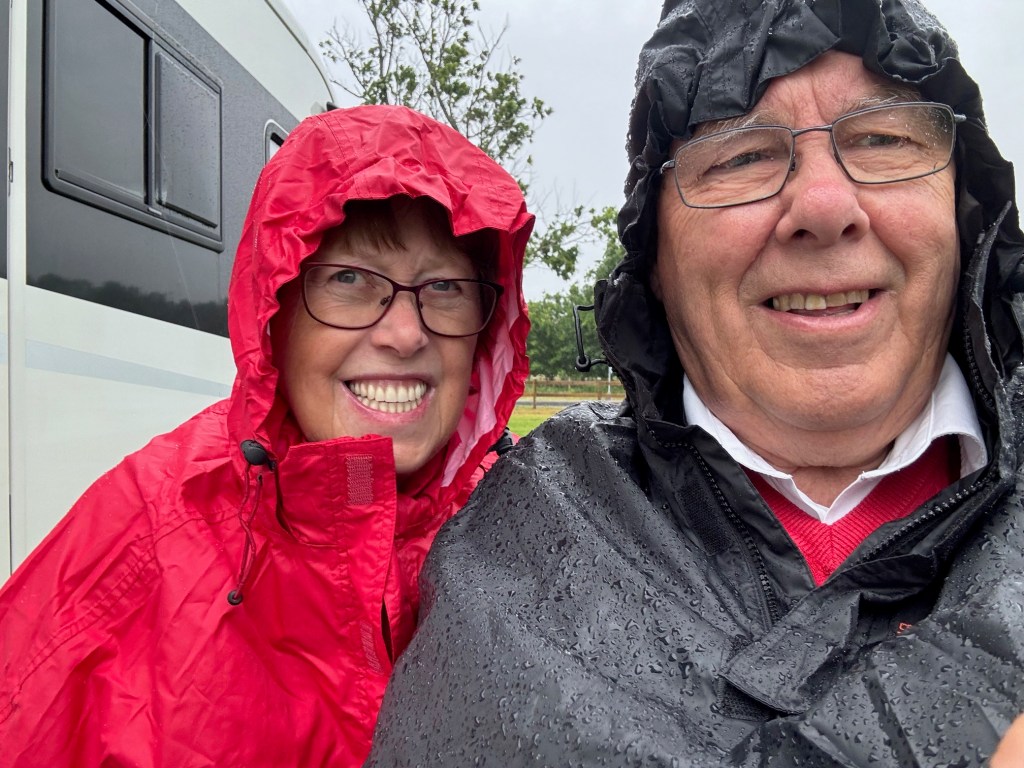 Tidigt under dagen plockade vi in allt som fanns ute under markisen och rullade in den. Vid 14- tiden började ett av de värsta blåst & ösregn som jag varit med om, som sedan höll på oavbrutet i 5- 6 timmar. Vi tog på oss våra poncho och gick iväg i god tid till invigningen av Klippan, den nya kyrkan på Bödagården. Ett paraply gjorde ingen nytta idag.