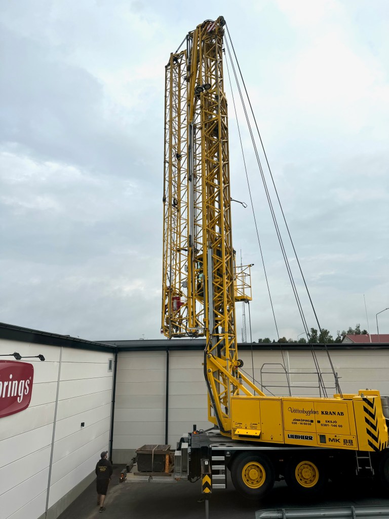 Den första kranföraren jobbade i timmar med sin kran, men lyckades inte överlista felet med den. Efter ett par timmar kom det en ny kran i samma utförande och sedan dansade pallarna upp på taket.