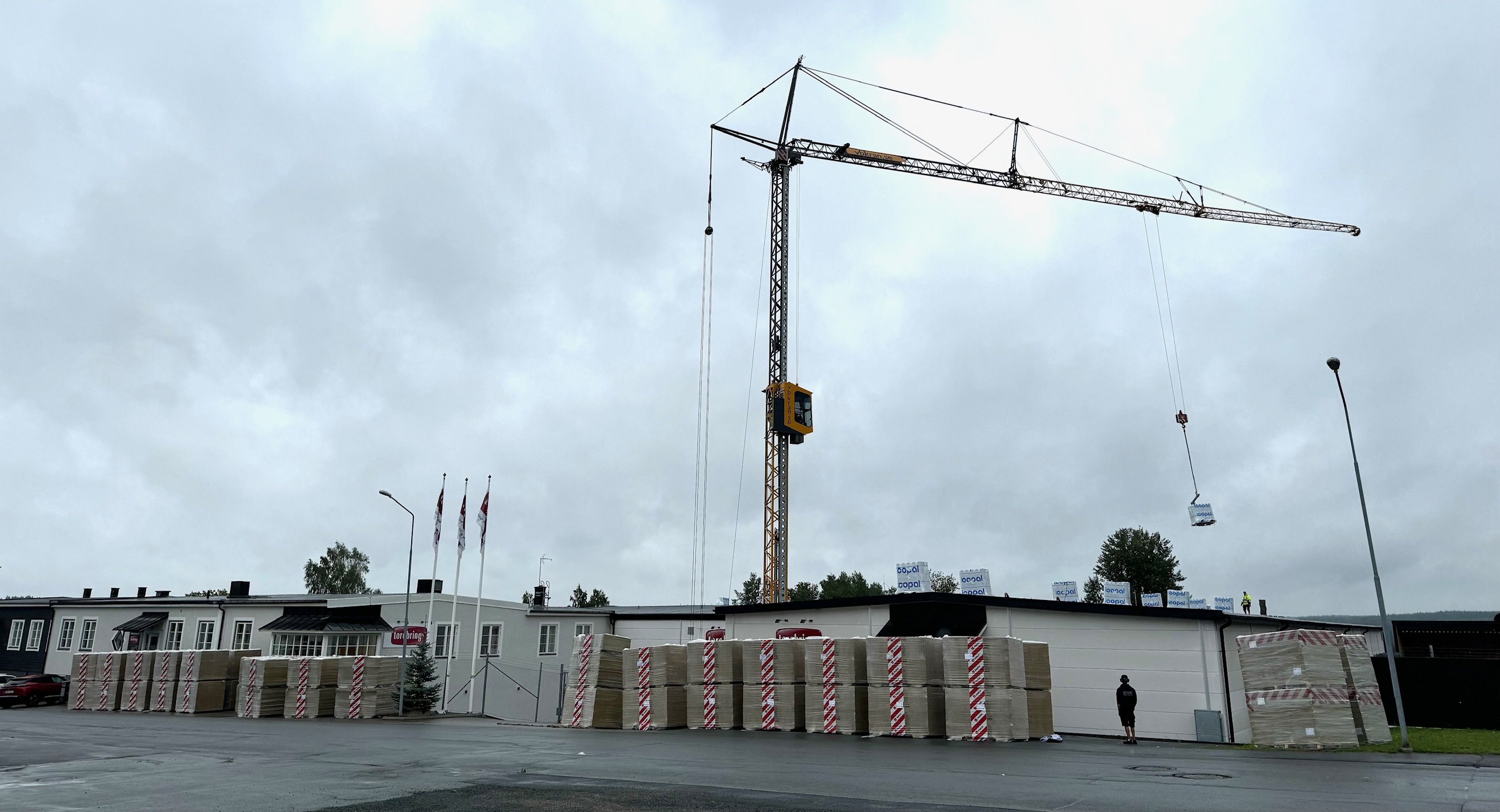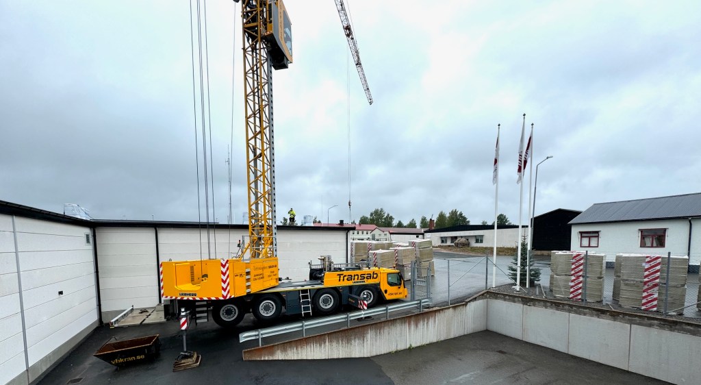 Först kom en kran sedan kom det en kran till.Hela parkeringen blev full av alla pallar med papp och isolering.
