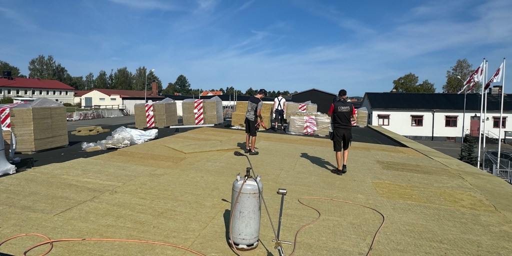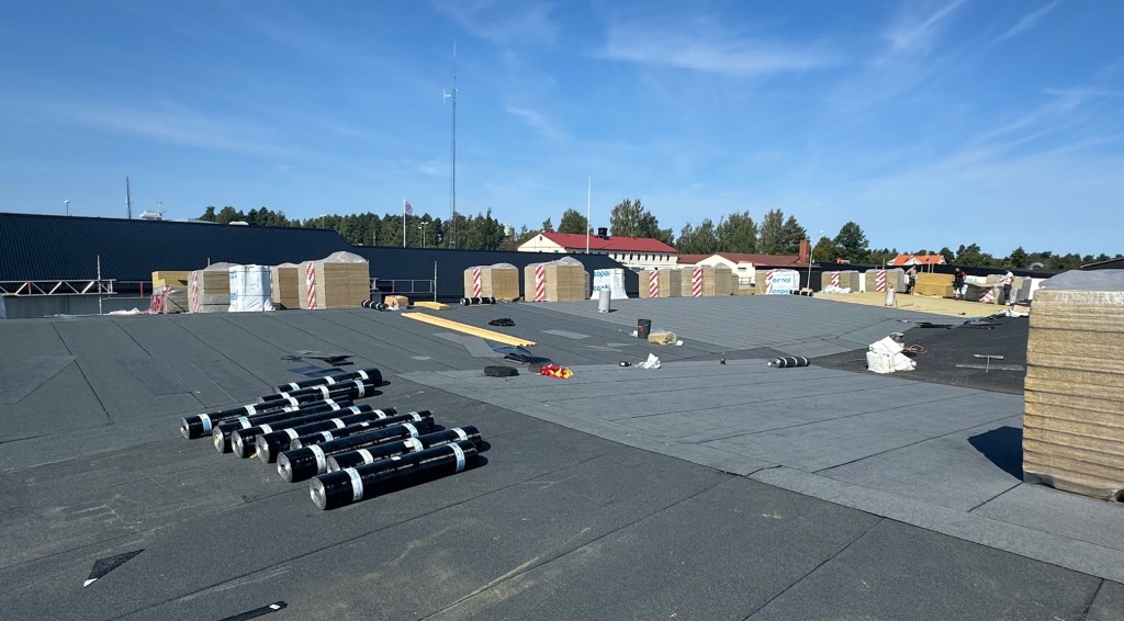 Snart är hela taket, 2040 m2, på den äldre delen färdig isolerat. Alla andra tak är rätt byggda från början. Inte en enda droppe regn har kommit, sedan de började takläggningen.