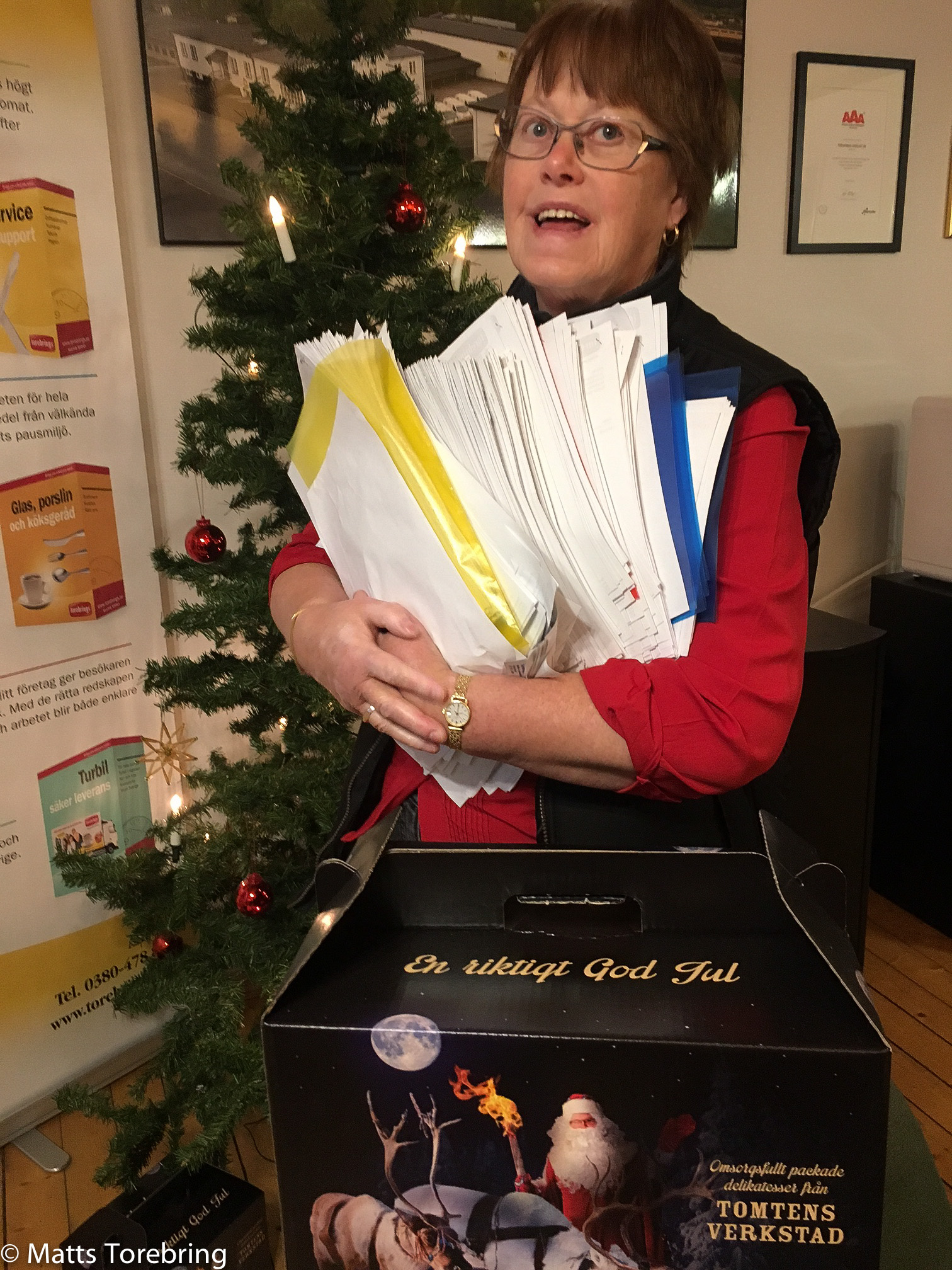Att på dessa tre till fyra veckor prestera, det vi har gjort i år, är nästan på gränsen till ett överdåd. Totalt har vi packat packat 22 000 Tomtelådor och Tomtesäckar, som skall ut över hela Sverige. Det är inte bara packningen, den kan jag uppleva ganska bra flyt i. Men logistiken är en jätteapparat. Telefonen störtringer i ett, skärmen är svart av mejl, frågorna är tusentals. Detta trots att vi har byggt ut, ett stort informationsflöde, genom mejl och sms.”Jag är snickare, jag läser inte datorn, när kommer beställningen”?
