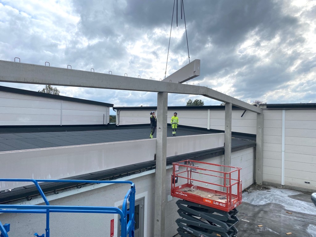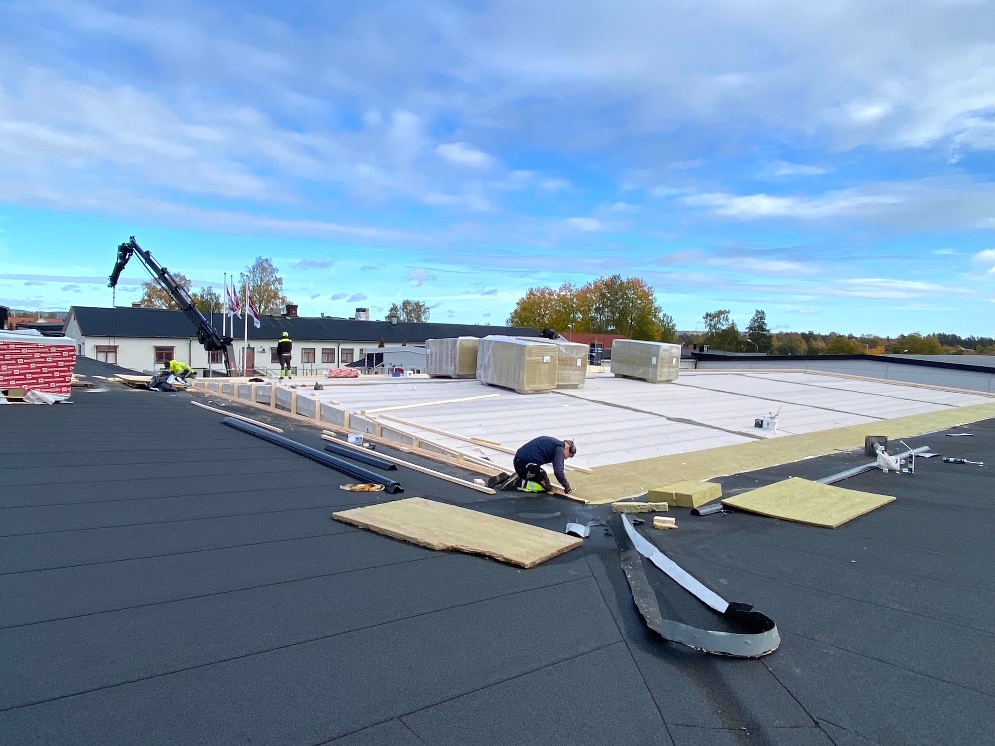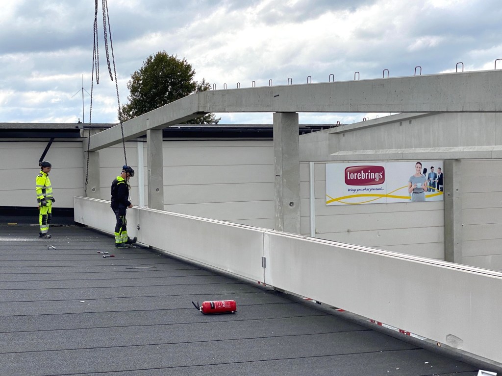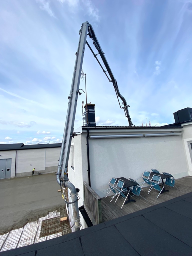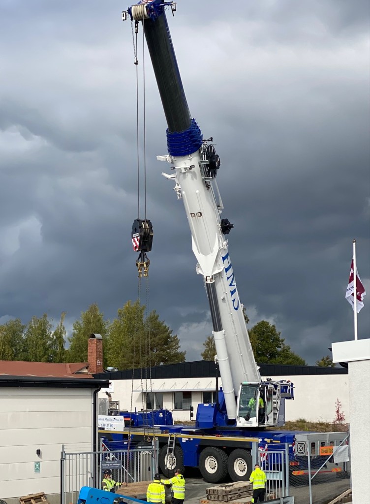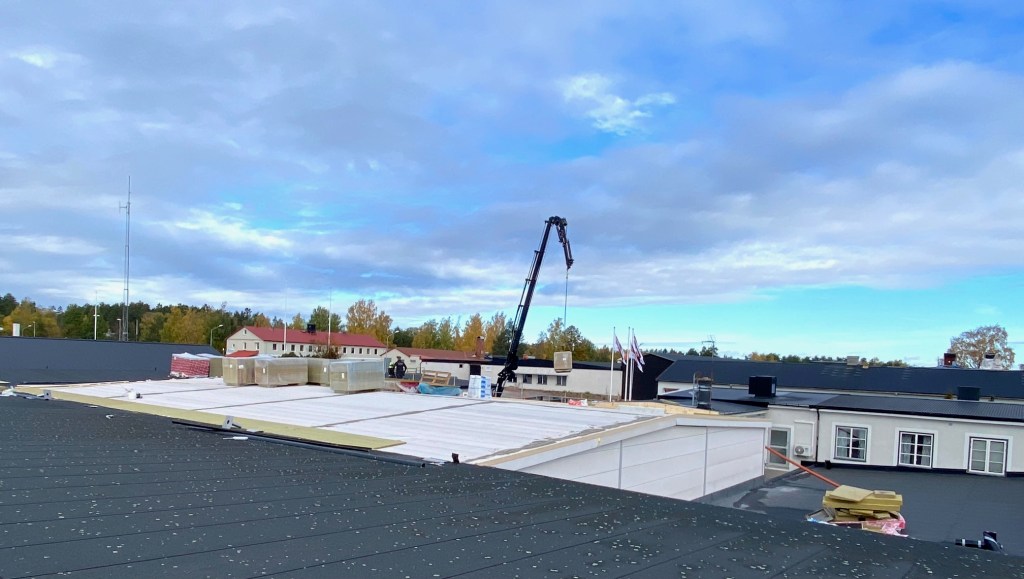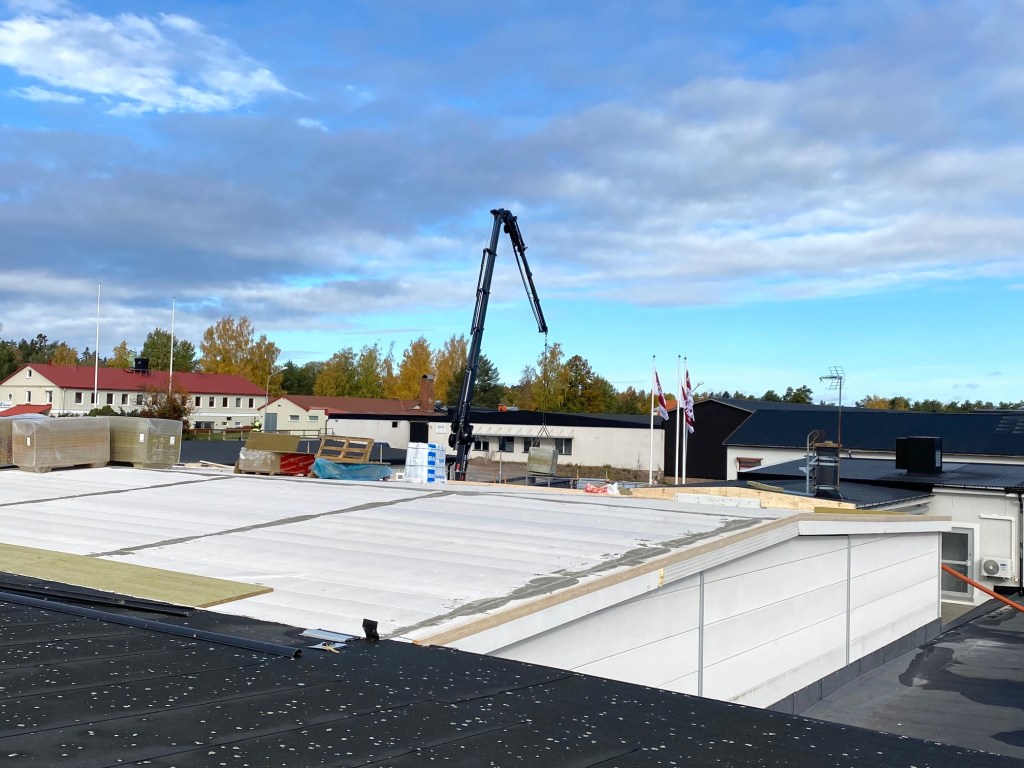 Jag tog mod till mig och klättrade upp på taket, dock utan hjälm som statsministern brukar ta på sig vid industribesök. Idag är det minst sagt full aktivitet på vårt bygge. Snickare, plåtslagare, takläggare och en kranbil. Kändes nästan lite otroligt att se ut över 5000 m2 tak där uppe. Jag började ju hemma i villans garage 1976 …