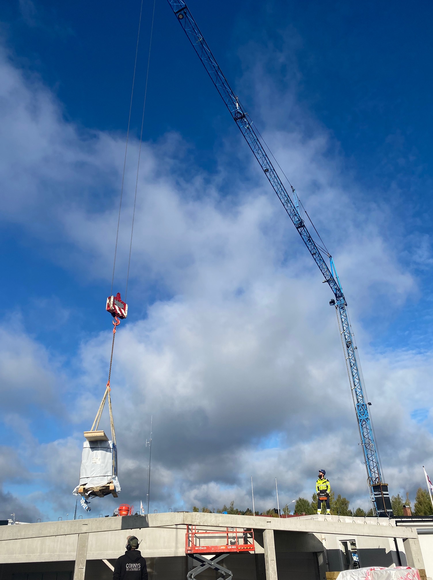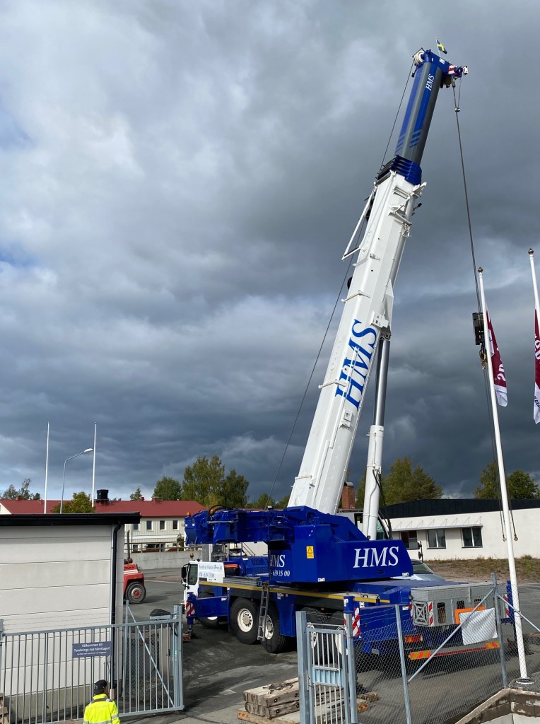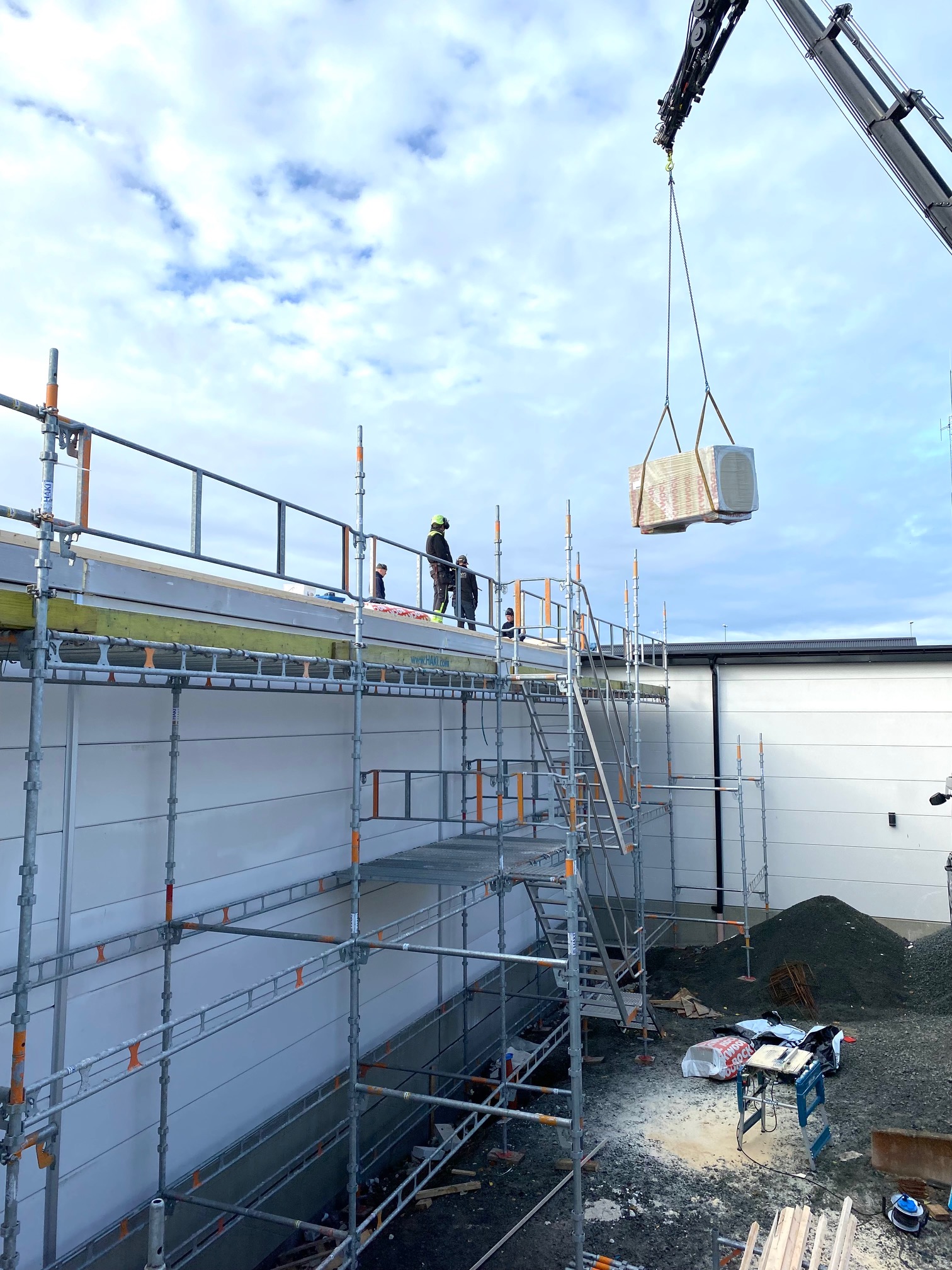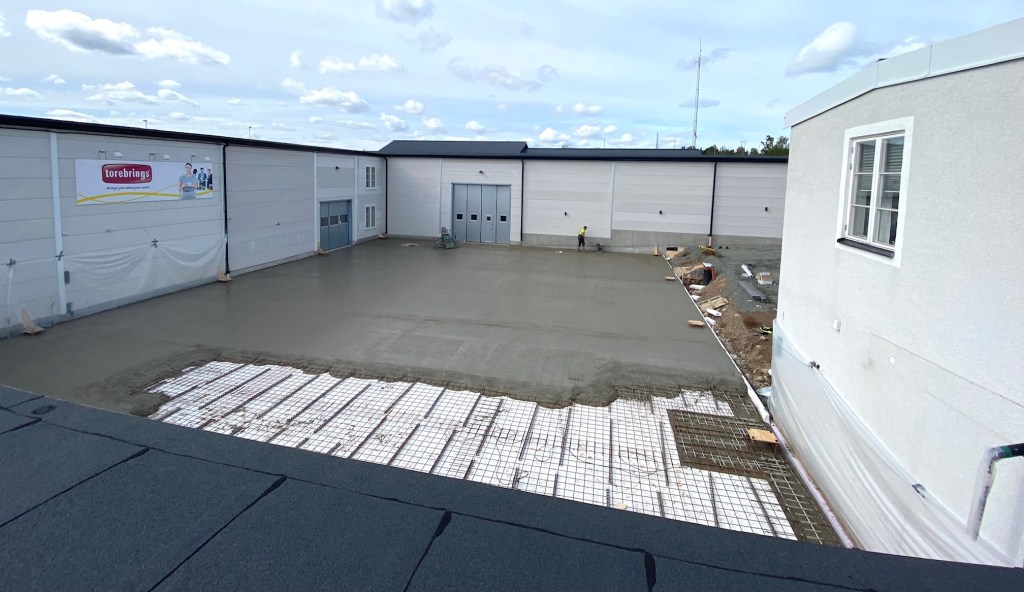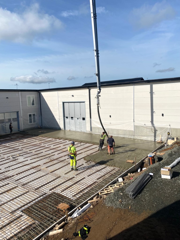 Jag tog mod till mig och klättrade upp på taket, dock utan hjälm som statsministern brukar ta på sig vid industribesök. Idag är det minst sagt full aktivitet på vårt bygge. Snickare, plåtslagare, takläggare och en kranbil. Kändes nästan lite otroligt att se ut över 5000 m2 tak där uppe. Jag började ju hemma i villans garage 1976 …