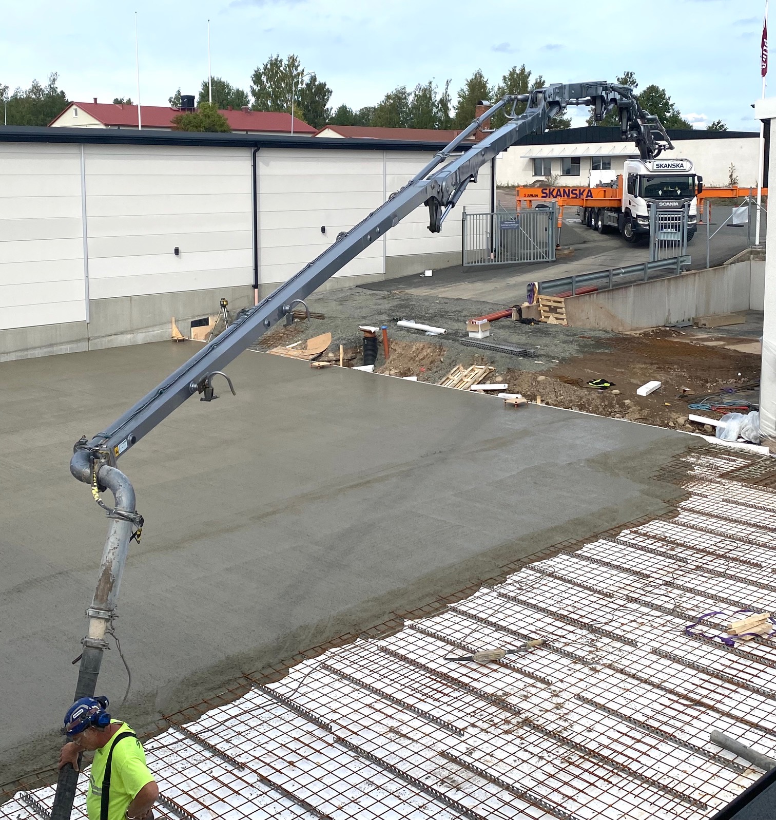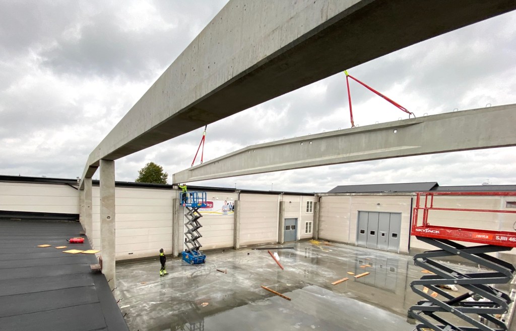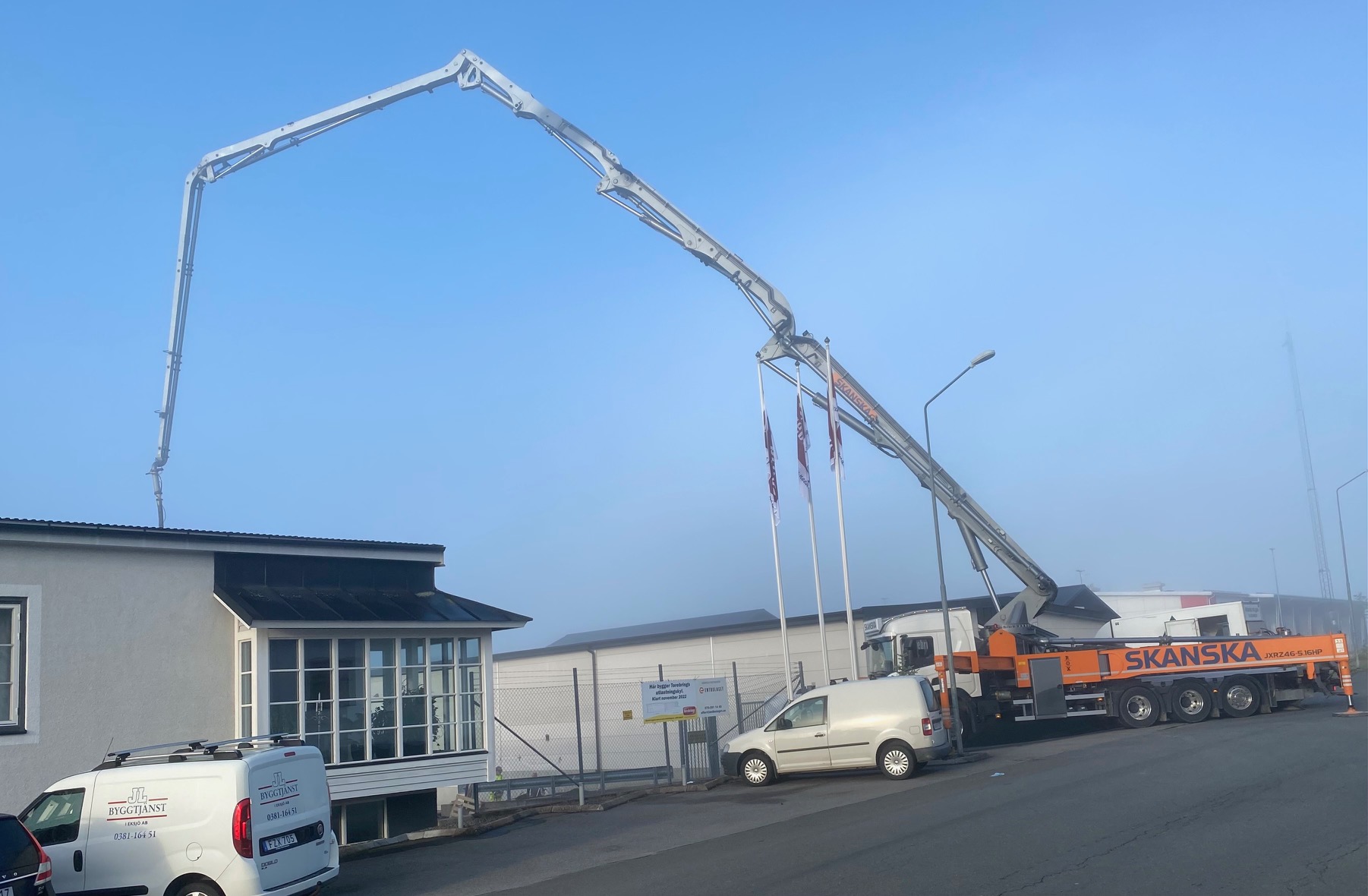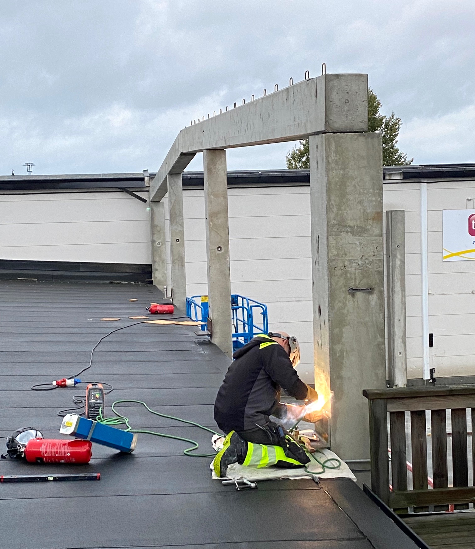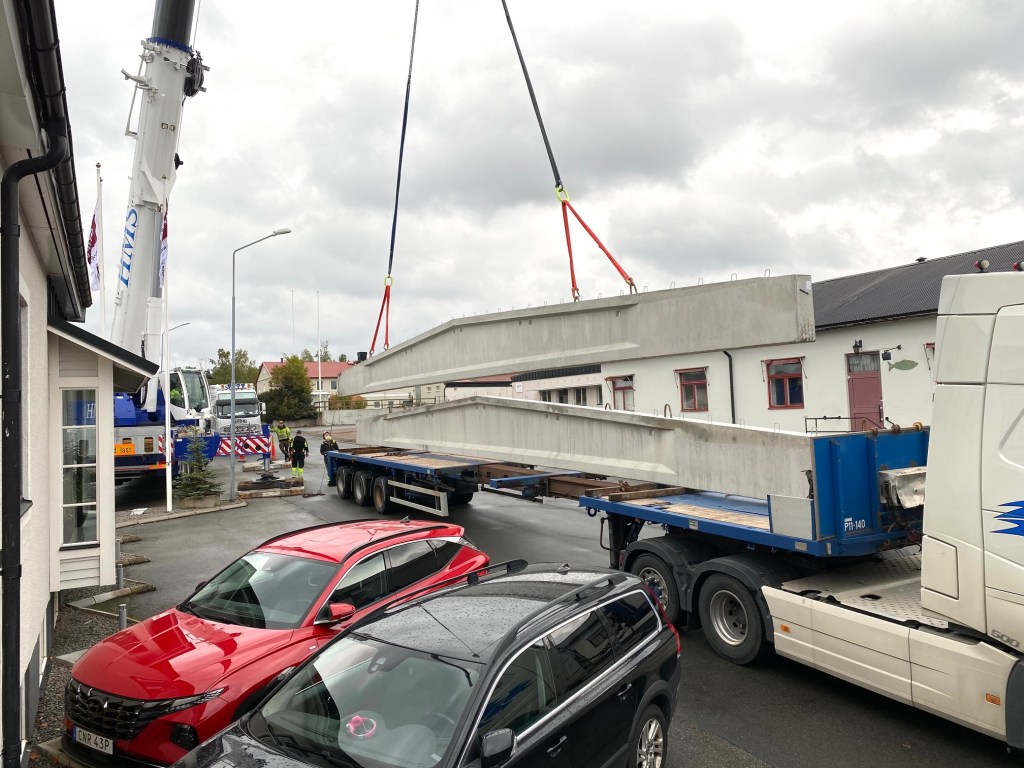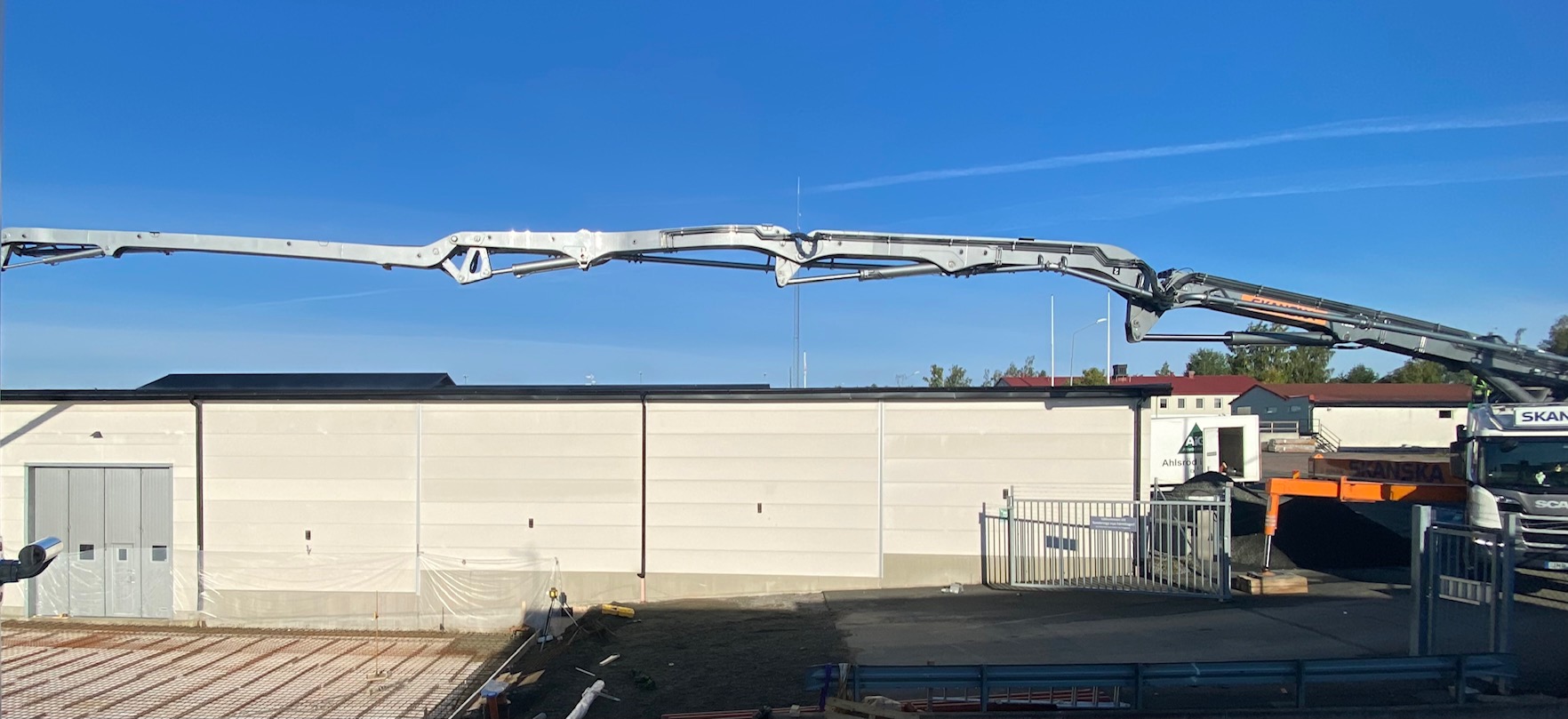 Jag tog mod till mig och klättrade upp på taket, dock utan hjälm som statsministern brukar ta på sig vid industribesök. Idag är det minst sagt full aktivitet på vårt bygge. Snickare, plåtslagare, takläggare och en kranbil. Kändes nästan lite otroligt att se ut över 5000 m2 tak där uppe. Jag började ju hemma i villans garage 1976 …