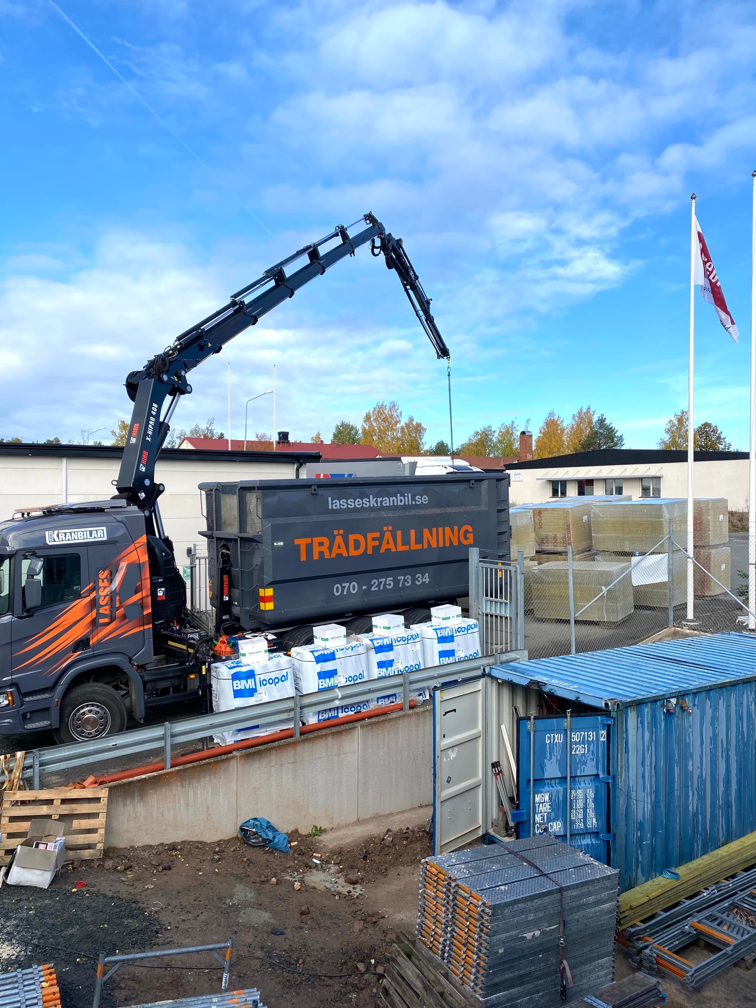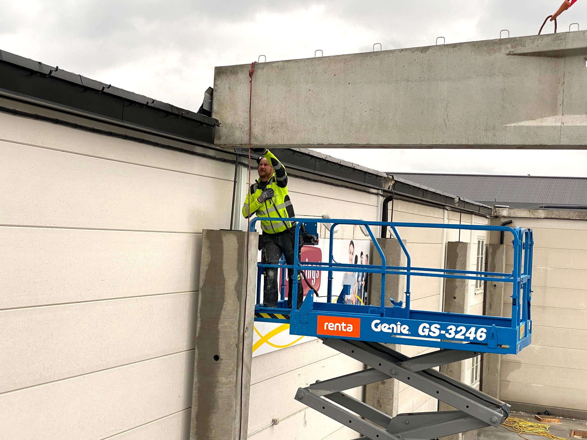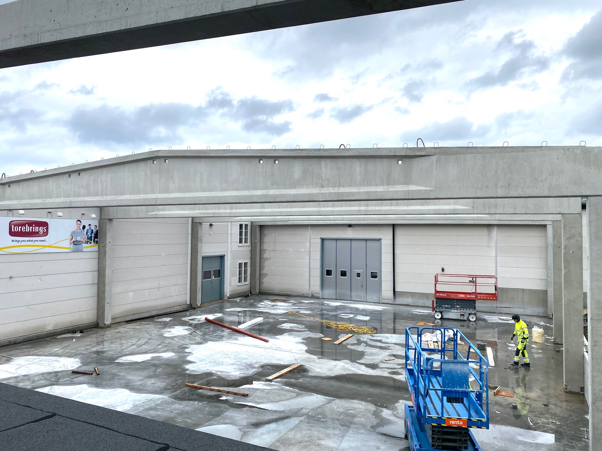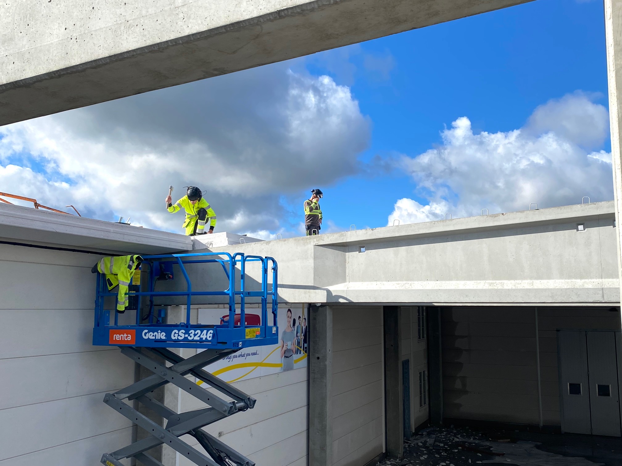 Jag tog mod till mig och klättrade upp på taket, dock utan hjälm som statsministern brukar ta på sig vid industribesök. Idag är det minst sagt full aktivitet på vårt bygge. Snickare, plåtslagare, takläggare och en kranbil. Kändes nästan lite otroligt att se ut över 5000 m2 tak där uppe. Jag började ju hemma i villans garage 1976 …