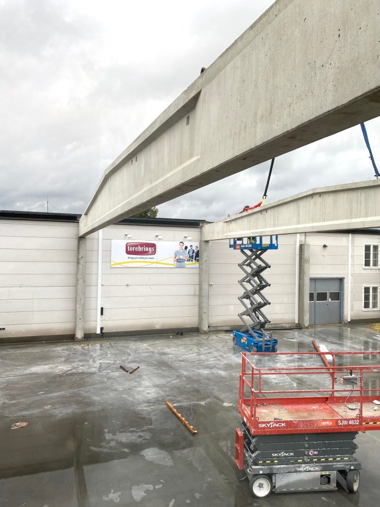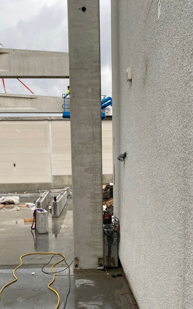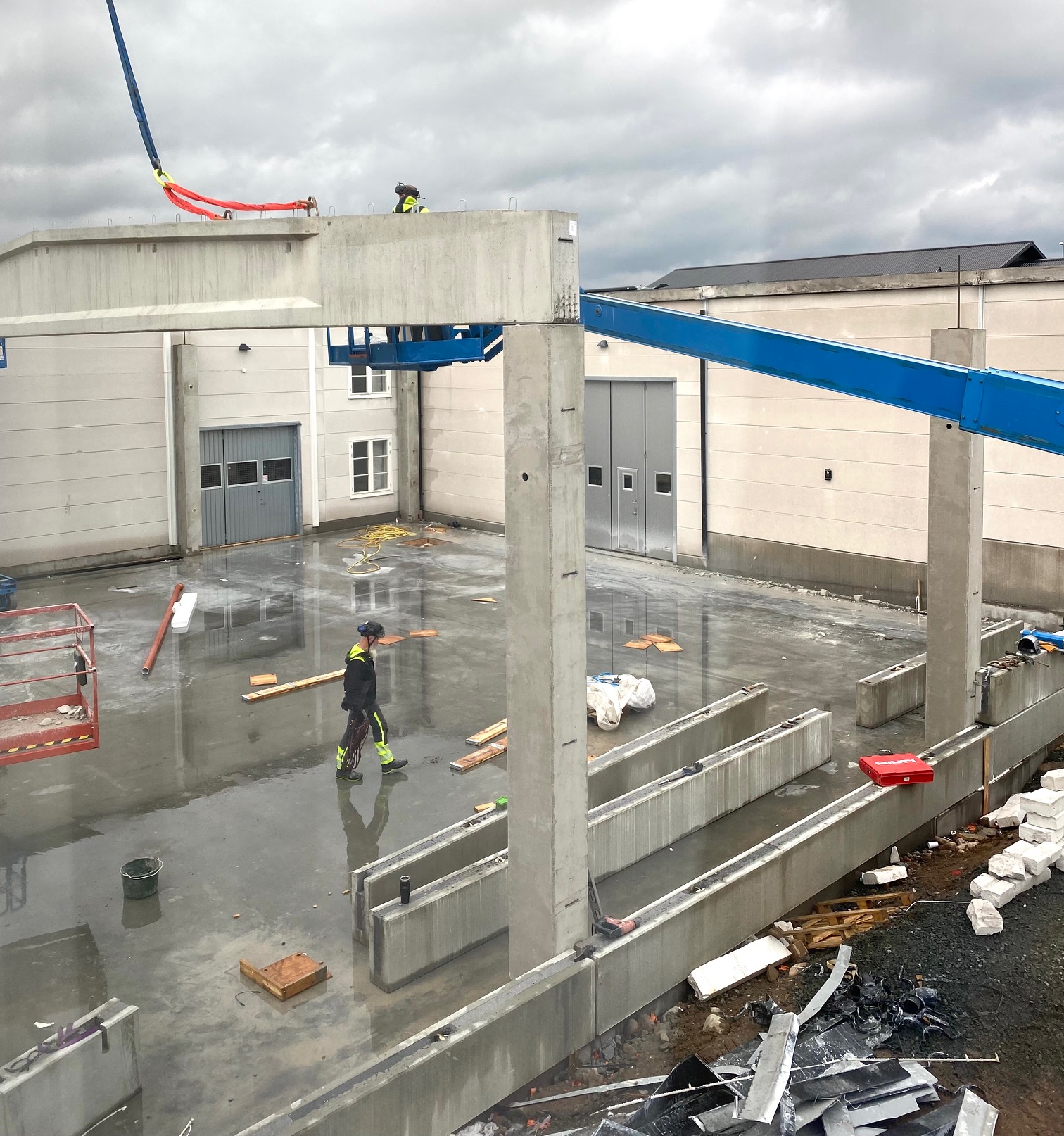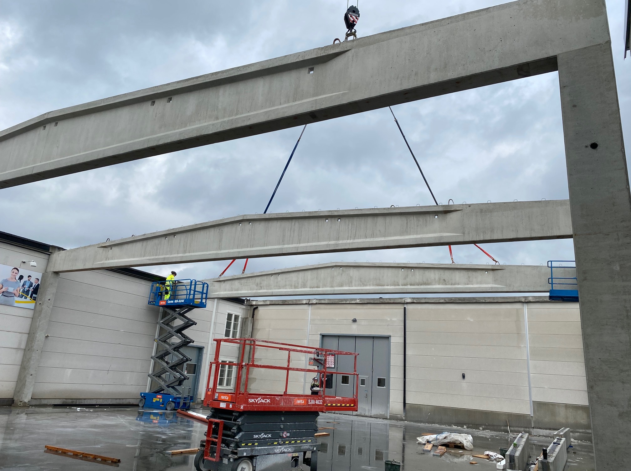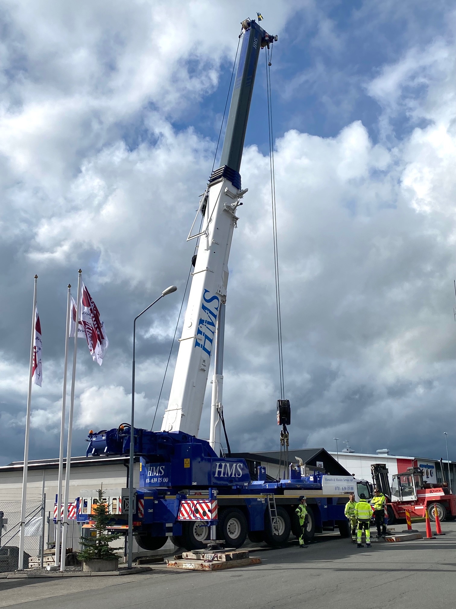 Jag tog mod till mig och klättrade upp på taket, dock utan hjälm som statsministern brukar ta på sig vid industribesök. Idag är det minst sagt full aktivitet på vårt bygge. Snickare, plåtslagare, takläggare och en kranbil. Kändes nästan lite otroligt att se ut över 5000 m2 tak där uppe. Jag började ju hemma i villans garage 1976 …