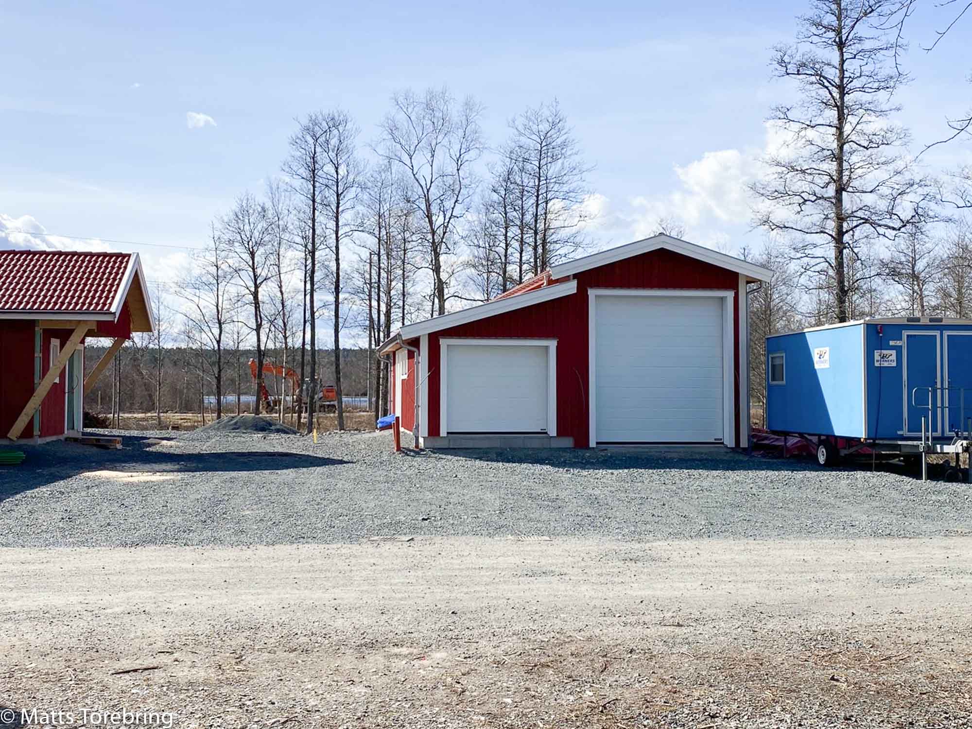 Garageinfarten får 12 cm betong på infarten, för att klara den tunga husbussen. Golvet i garaget ligger idag 12 cm över markytan, så det krävs inga stora insatser. Bara lite sänkning ute vid gatan. Alla övriga betongytor blir 10 cm tjock betong. Mellan garage och ladan kommer vi att bygga ett ”torg i betong”. En plats att umgås, parkera cykeln och en annorlunda ljussättning.