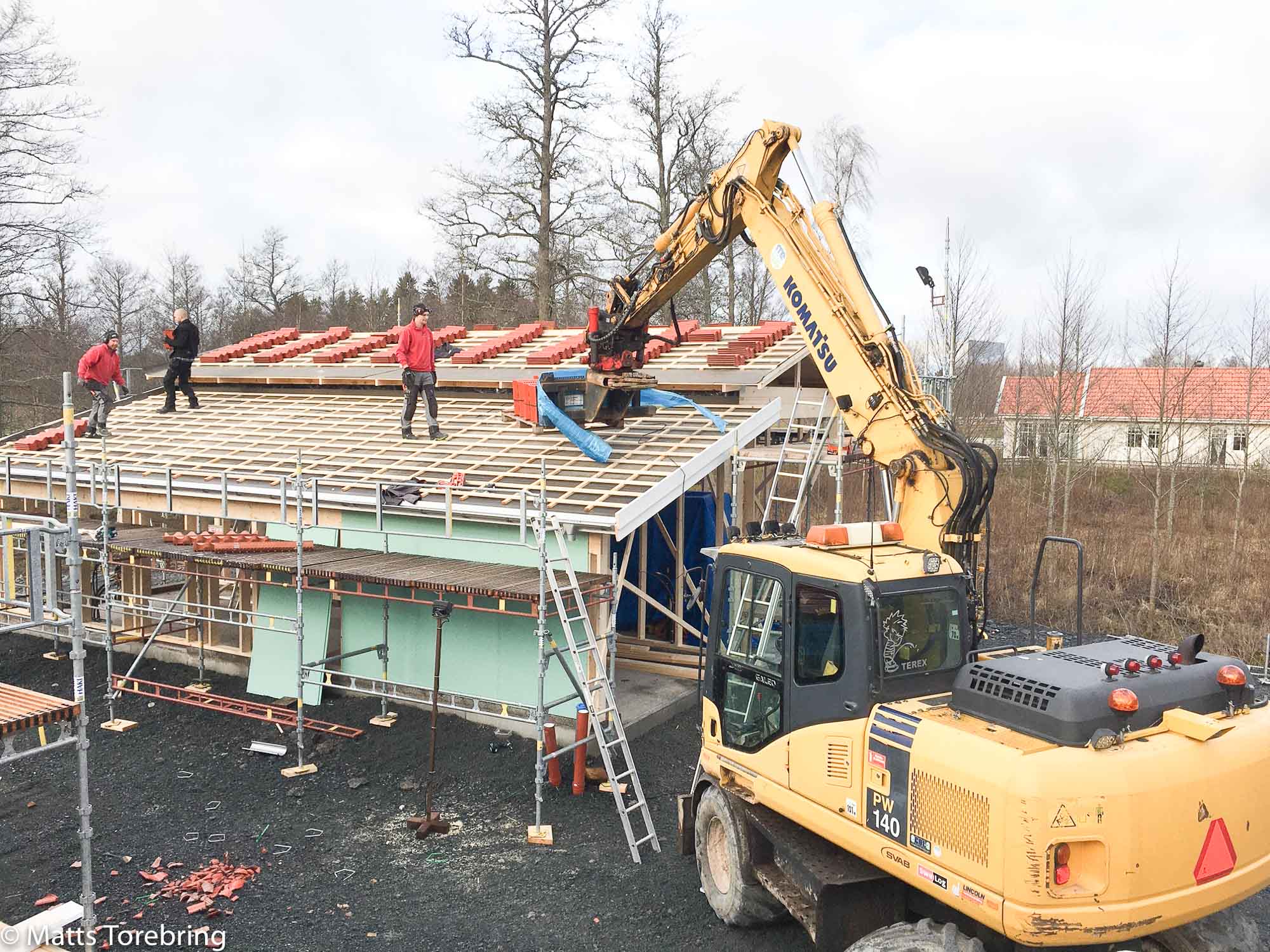 Idag blev garagetaket klart, bara någon vindskiva och plåt saknas. Min känsla för att garaget skulle se stort ut är borta. För att se garaget, måste man passera vårt hus. Först då ser man att det ligger ett garage inne på gården. Med lillgaraget på södersidan, försvinner garaget till husbussen. Garaget ligger tio meter från vår lada.