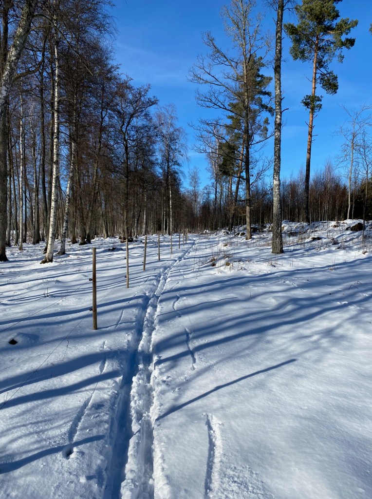Mina längdskidor har legat på en hylla i förrådet i många år, utan att ha blivit använda. Det har varit brist på snö, vi byggde vårt nya hem, jag opererades och så alltid rädslan för att inte kunna valla, har gjort att mina skidor inte blivit använda. Idag tog solen överhanden och till slut lockade den ut mig.