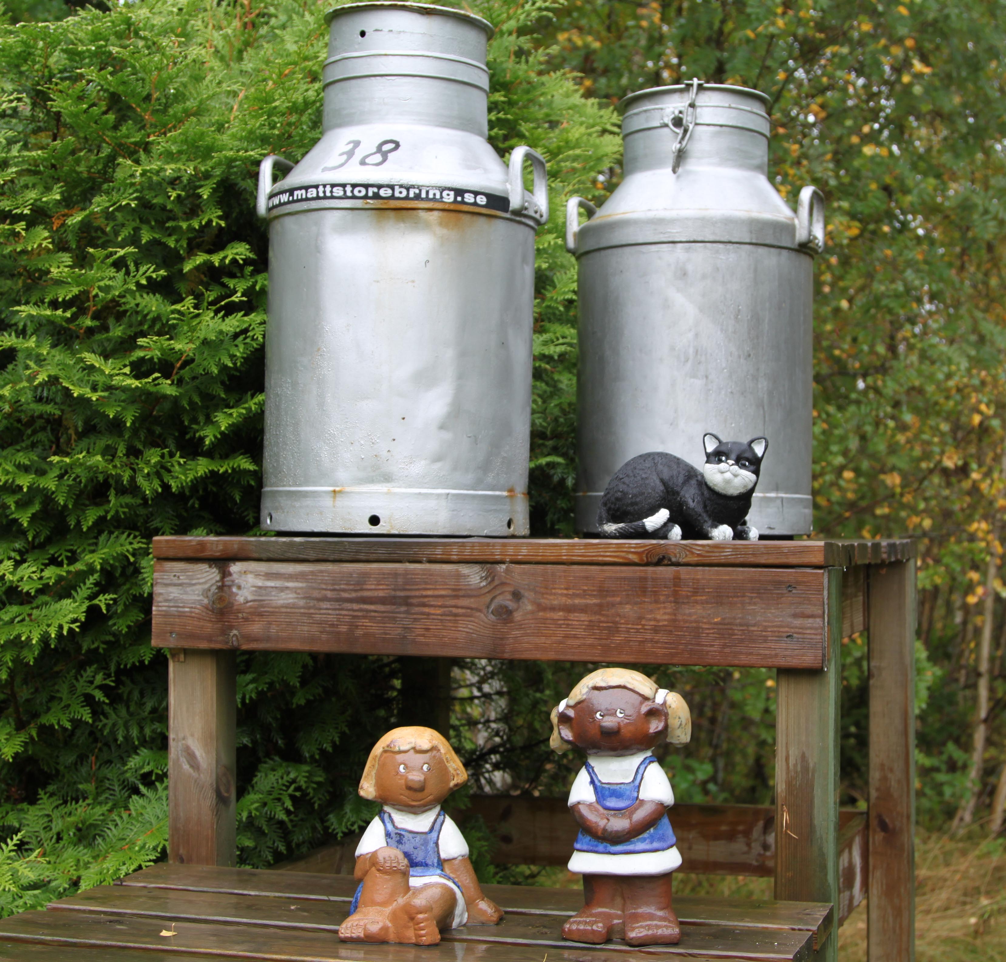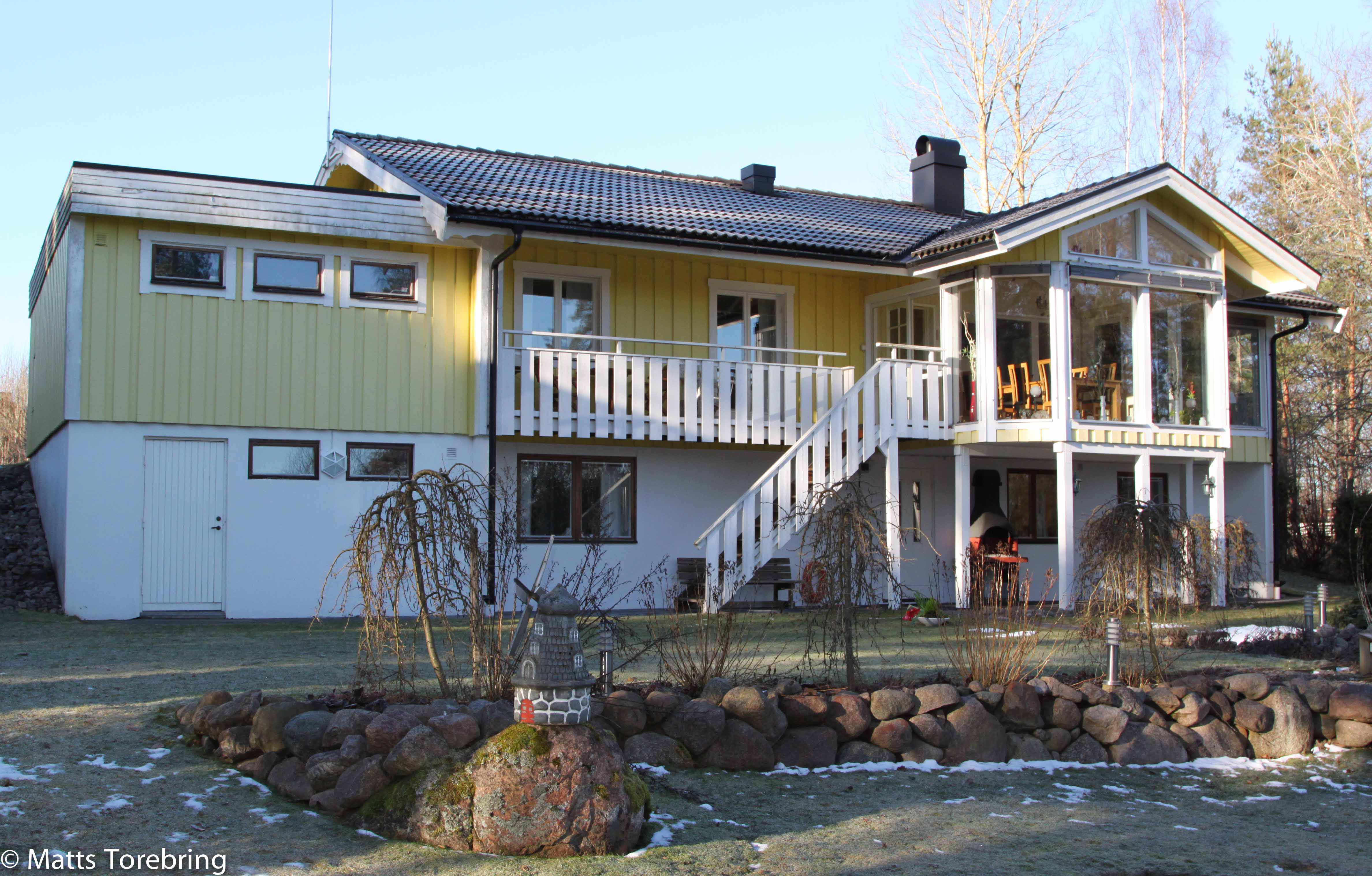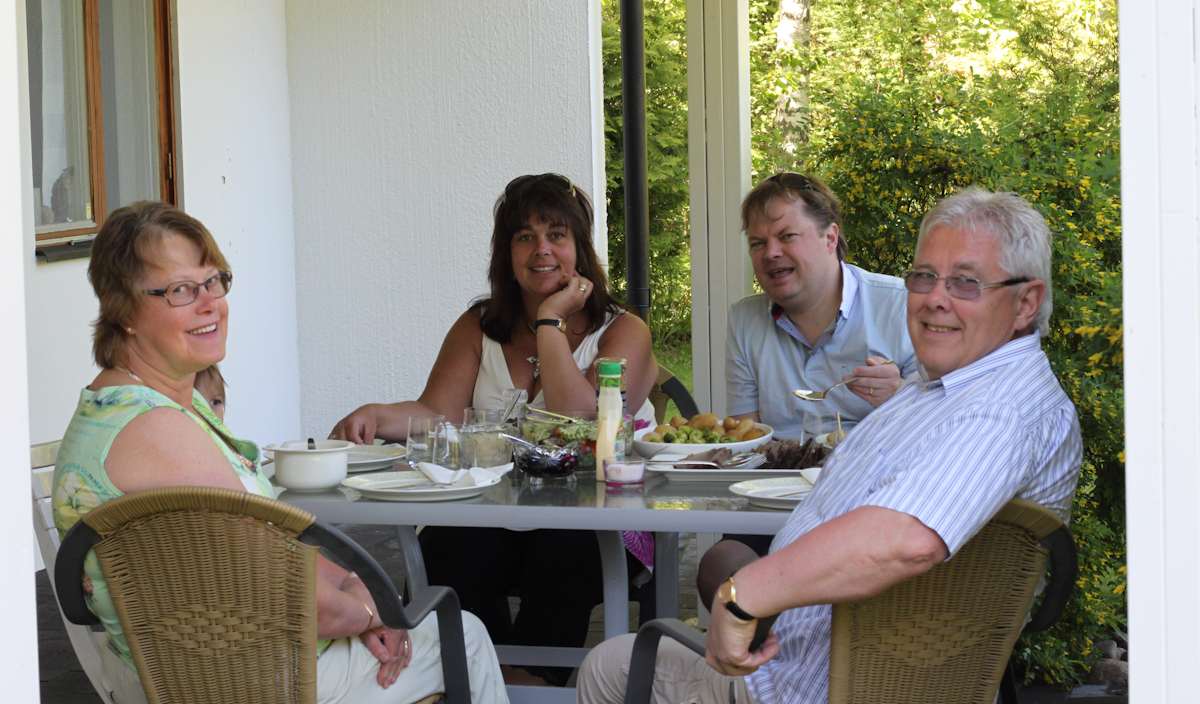 En stor och tung soffa i massivt virke från Hags, Aneby, samt ett bord vi hittat på utförsäljning. Riktigt skönt att sitta här när solen lyser på framsidan. Vill vi har mera skugga har vi en uteplats på baksidan under tak samt även en balkong som vi sitter på när vi är bara två. Positivt överraskad att möblerna smälte in så bra mot ”golvet”. Huset skall också få en annan färg senare.