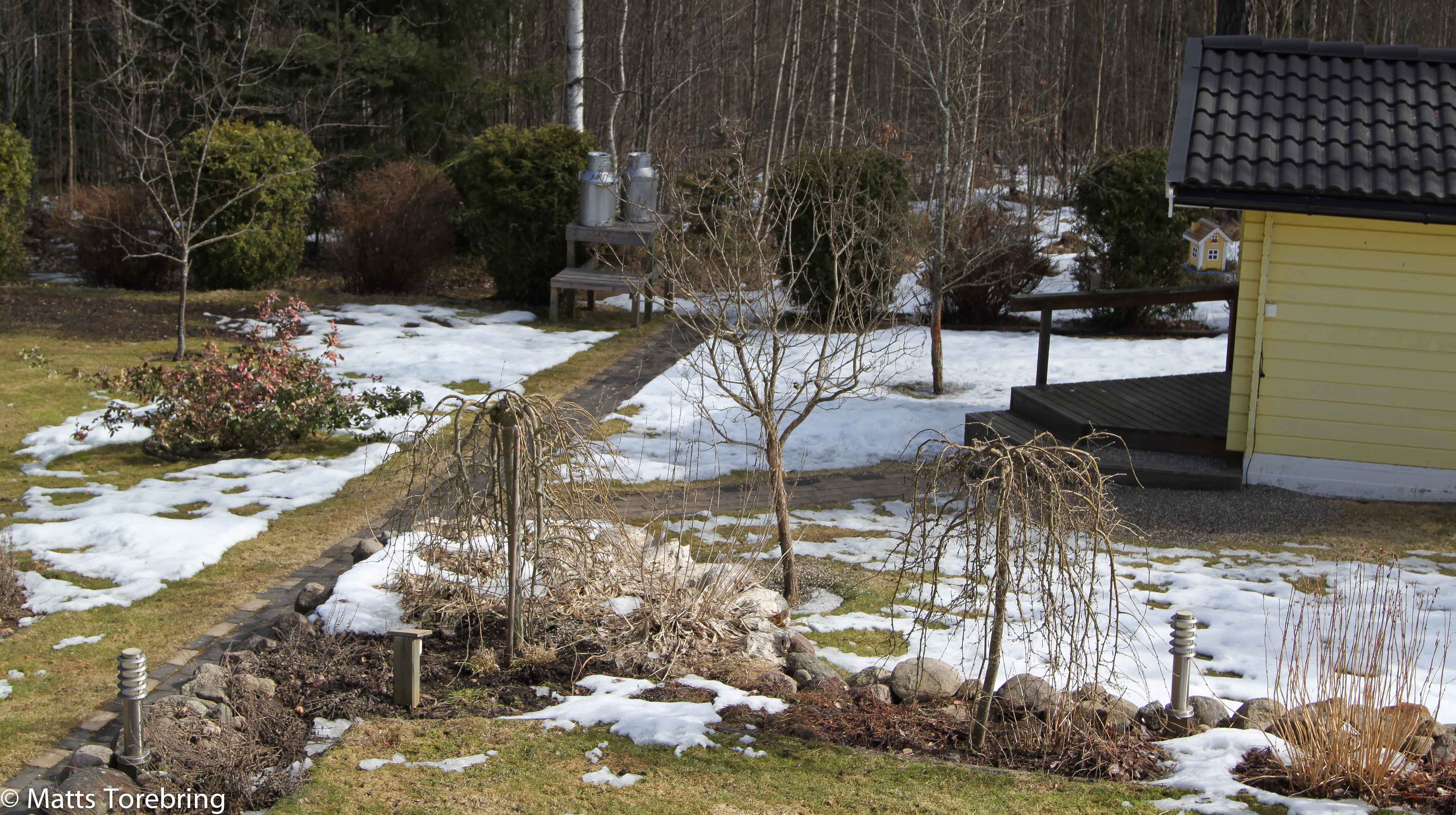Vad menar du Matts med att vi haft en bra vinter….? Jag har minst runt ett par hundra m2 belagd med marksten som på bilden. Trots att denna marksten ligger helt tätt, brukar det bli mossa i skarvarna, men inte denna vinter. Det har varit för kallt helt enkelt, ingen mossa har kunnat växa. Vissa år har jag gått i timmar med högtryckstvätten för att vårstäda, i år tog det ingen tid alls. Visst är det positivt, allt tack vare den kalla vintern.