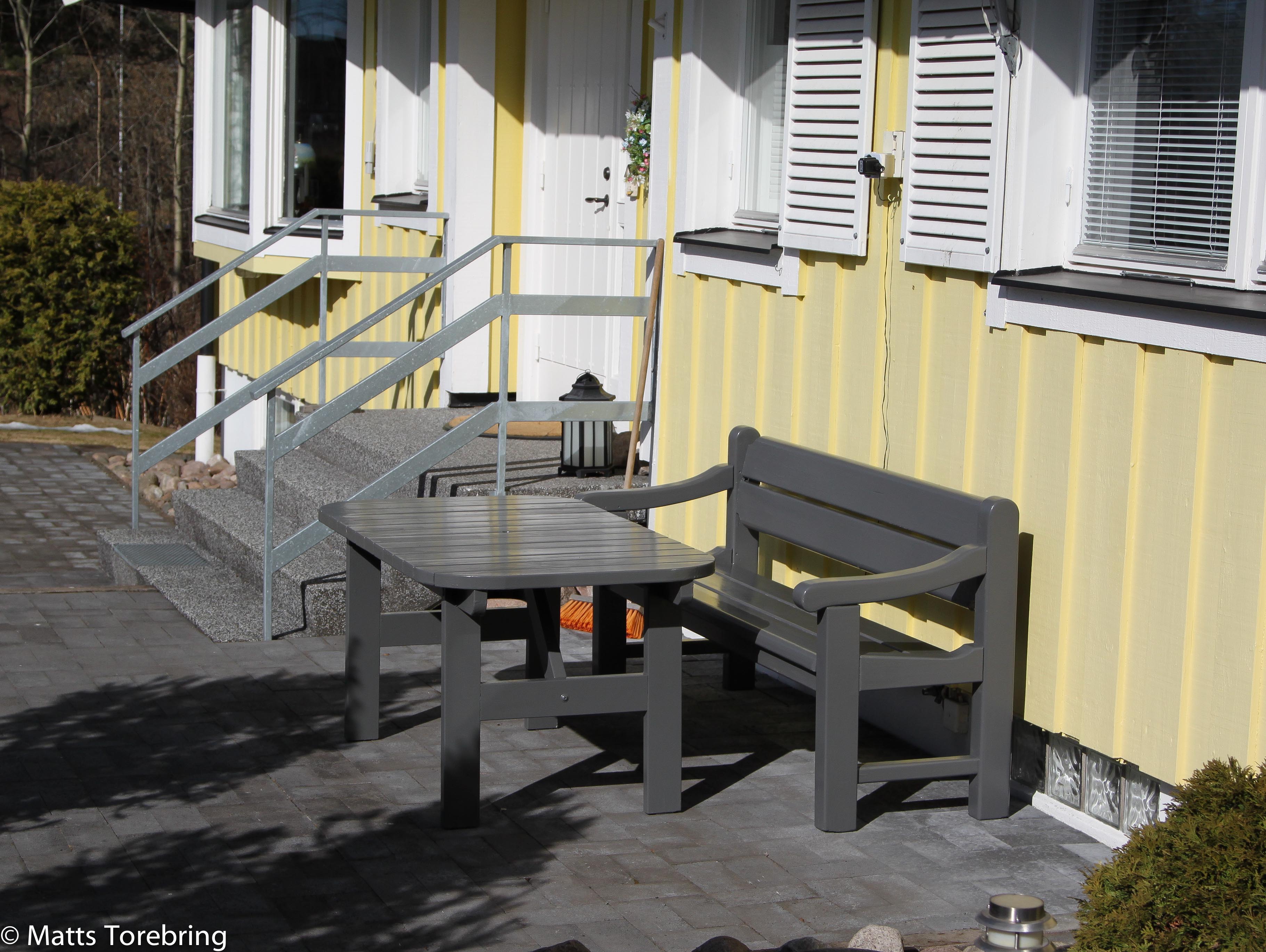 I höstas bar jag in våra tunga utmöbler i förrådet. I vanliga fall får de stå ute under tak. Varje dag under vintern har jag tänkt att jag borde måla dem nu, så de är klara till våren kommer, men inspirationen har saknats. Under veckan som gått och de ljusa kvällarna och så kom inspirationen åter att göra lite ute. Jag hann med att tvätta båda bilarna och en kväll slipade jag och algbekämpade utemöblerna. Jag drog på bra med värme och i går kunde jag måla dem två gånger. Förut var de vita och alla ni som har hus med vita knutar vet hur den vita färgen blir ganska fort, svart och möglig. Nu ville jag anpassa möblerna till plattsättningen. Även husknutarna kommer att få samma färg vad det lider.