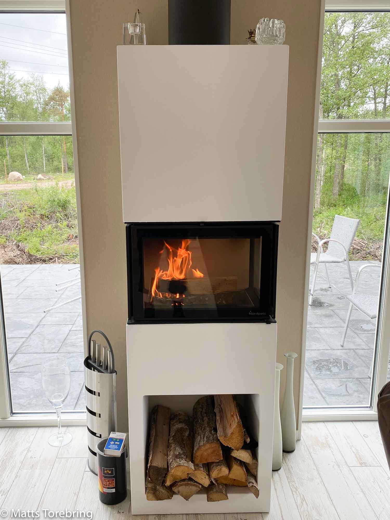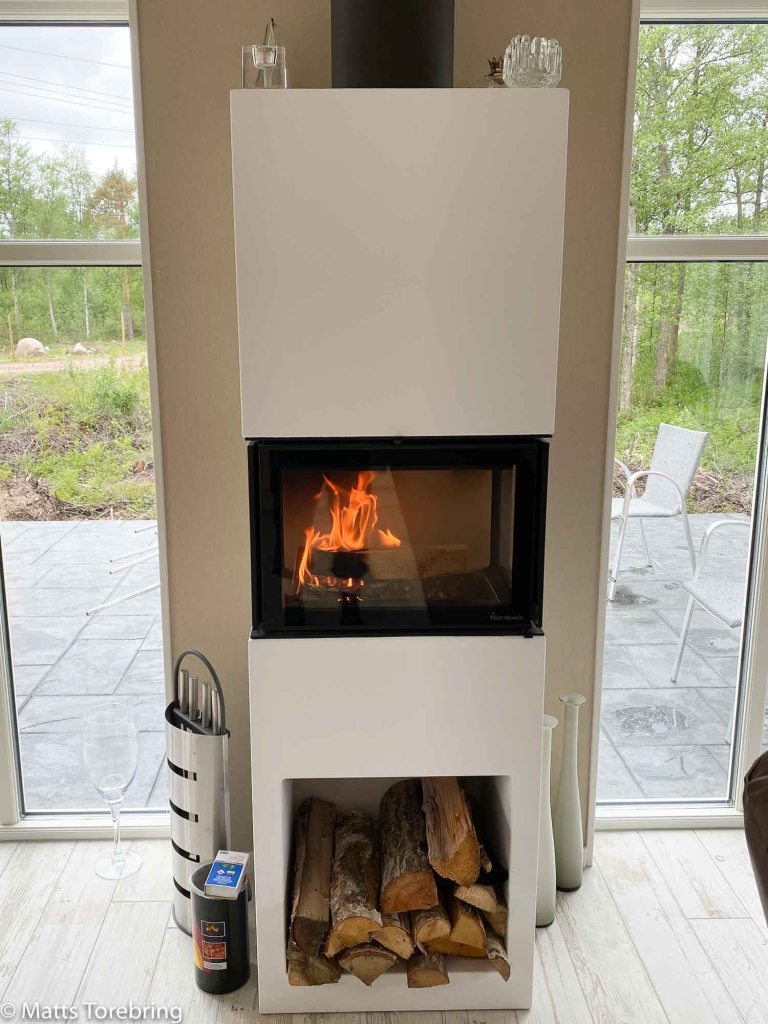 I vår fantastiska spis Nordpeis, kan vi elda upp som mest 3- 5 vedträd på en kväll. Det brinner säkert i en timma, blir varmt och gott och knappast ingen aska. Sotaren ville komma bara vart tredje år, det finns ju ingen aska sa han.