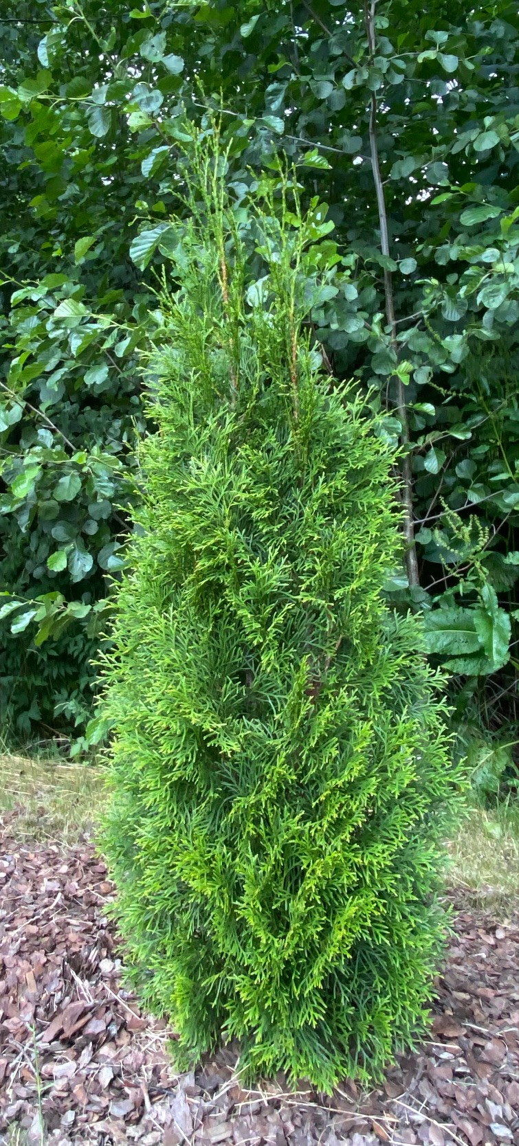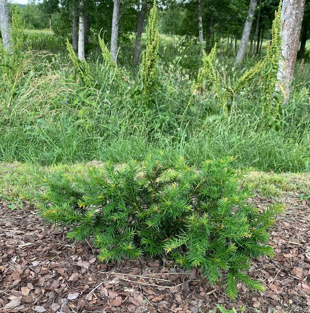 Vi planterade 118 st Thuja Smaragd och 36 styck Taxus Repondens (krypande Idegran). Jag är så glad att precis alla växer och frodas, t.o.m. de sista 10 som var ute och dansade runt med Postnord i 10 dagar i full värme.