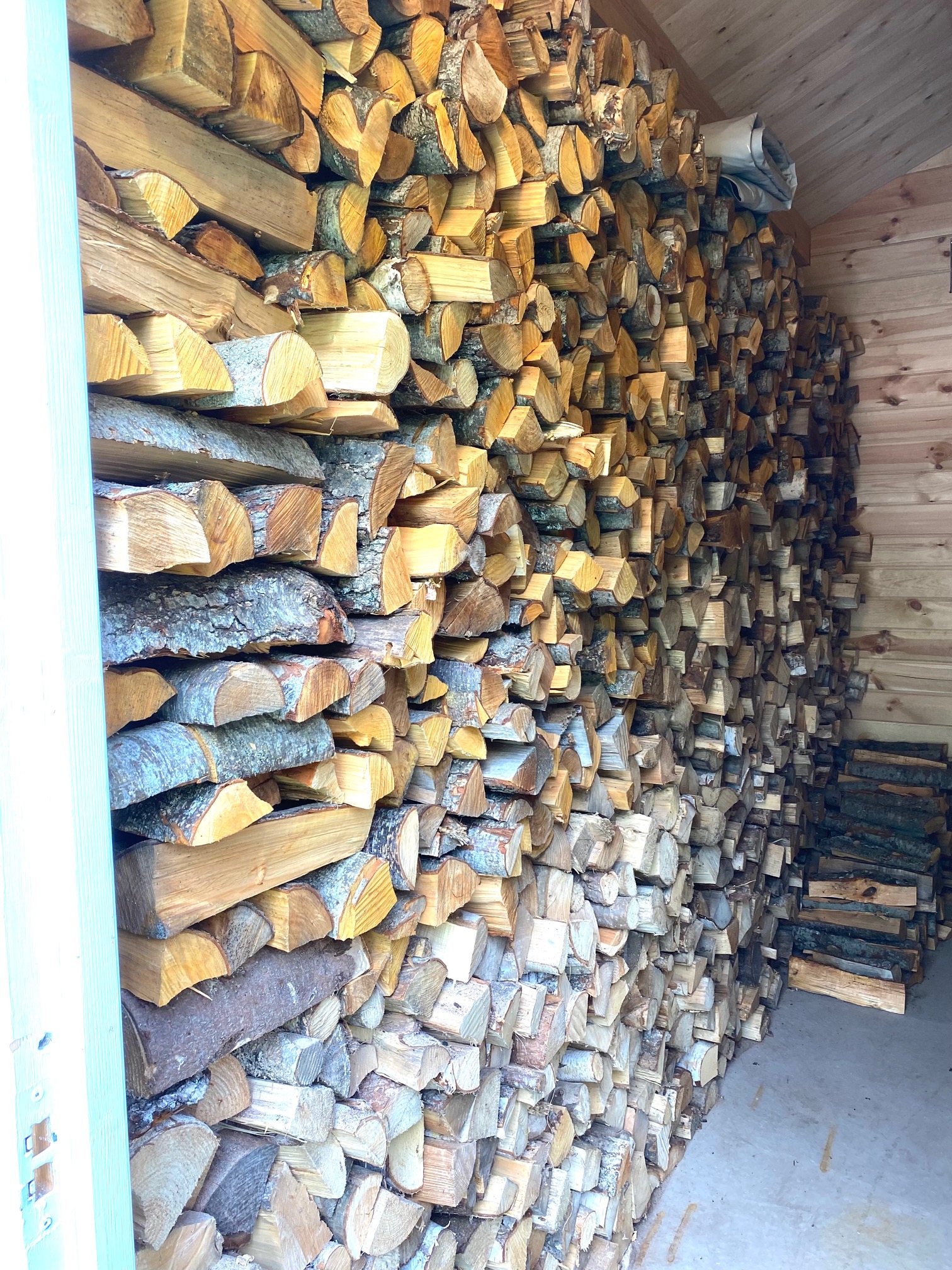 Jag sålde ett antal pallar med ved under resans gång, då jag insåg att jag skulle ha ved i ytterligare många år. När vi sedan flyttat in i vårt nya hem och byggt en Friggebod, flyttade vi veden igen till sista hållplatsen. Uppe på allt detta blev det ytterligare en liten vedstack med vårved som nu är inburen. Nu har vi 4 floer med ved, 4 meter långa och 2,40 höga. Detta innebär att vid har ved i 12- 14 år framåt om vi får leva.