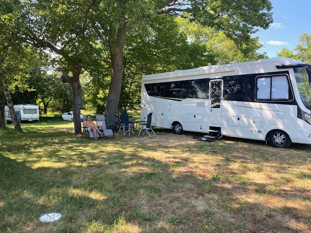 De flesta platserna finns ute på en stor äng utan träd som skuggar. Vår plats är helt fantastiskt underbar med skugga under de stora ekarna.