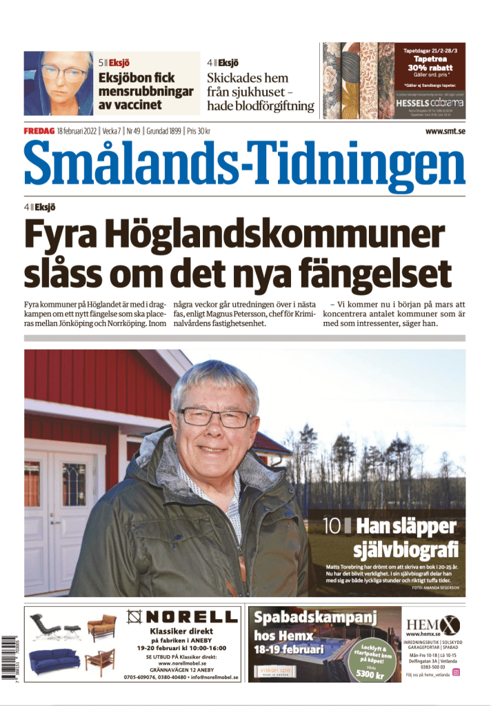 När jag öppnade vår digitala tidning vid 6 snåret idag på morgonen i Vadstena, överraskades jag av att vara med på första sidan. Vad roligt i dessa tider när det talas om pallplatser hela dagarna. Att få komma högst upp på första sidan, det var verkligen roligt.