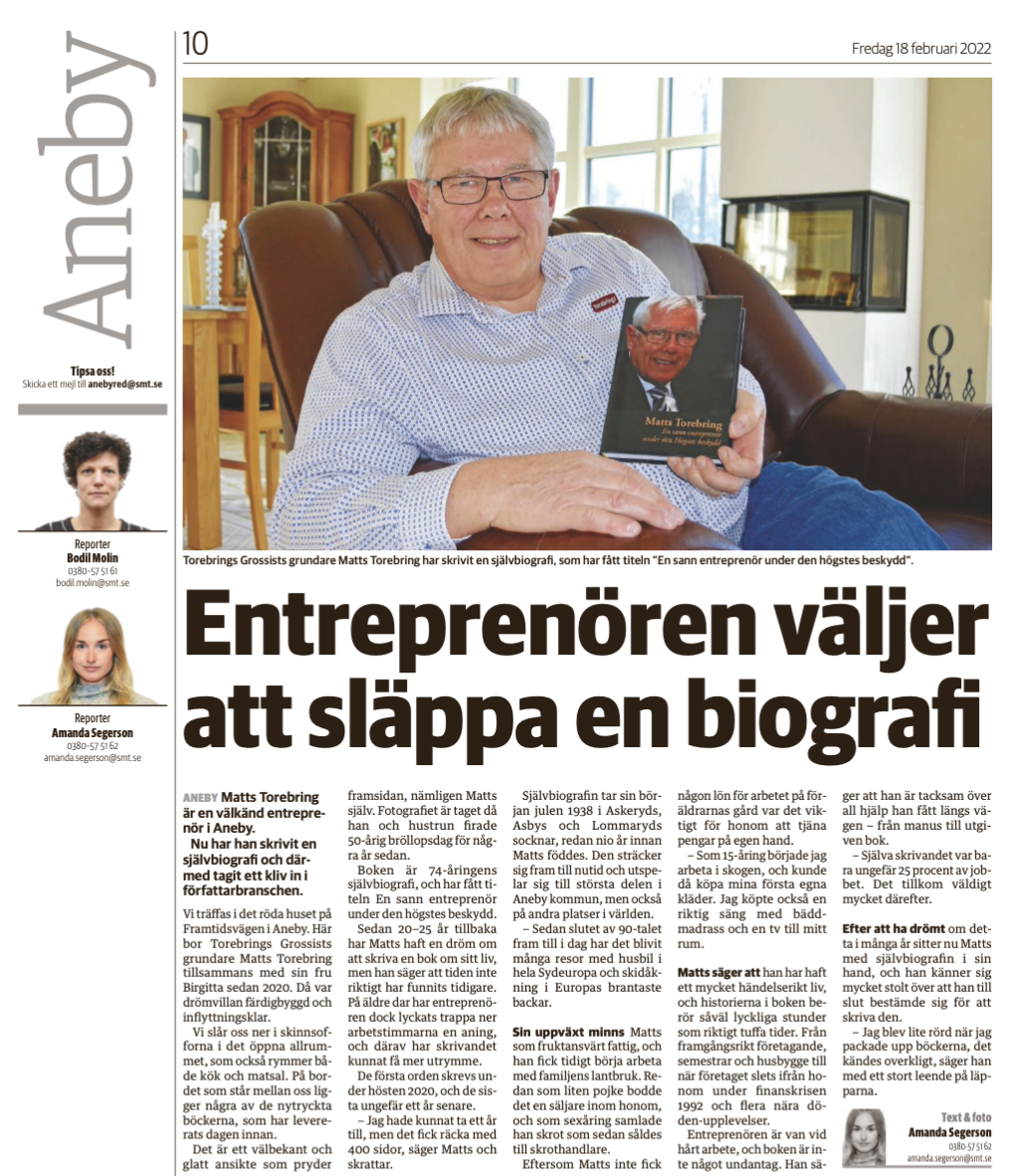 Anebyentreprenören, företagaren och bloggaren Matts Torebring har i bokform sammanfattat sitt snart 75-åriga liv. Titeln för verket är ”Matts Torebring – En sann entreprenör under den Högstes beskydd”.
