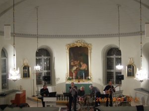 1 01 2009Söndag kväll den 25 jan -09 styrde vi bilen till Tånnö kyrka strax söder om Värnamo. Först sökte jag på GPS´en, när jag sedan kom dit såg jag att jag måste passerat här 100 tals gånger (gamla E 4:an) på väg söder över i slutet på 60- talet och tidigt 70-tal. Min gode vän Stig Sjöberg i gruppen Gospel Stompers puffade på att vi skulle komma. Det var ett sant nöje att lyssna till Stig och hans kompisar. Vilken konsert det blev. Vilka musiker och vilken sång. Tack Stig att du inbjöd oss.
