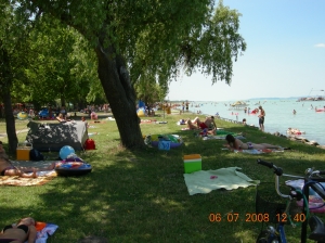 Här i Ungern är priserna låga, maten fantastiskt och naturen är vacker. Wienerschnitzeln första kvällen fick knappt rum på den stora tallriken och hade räckt till 2 personer. Nu är vi här och njuter en försmak av landet. Vi minns i vinter denna härliga gröna badstrand med det turkosfärgade vattnet, se nedan