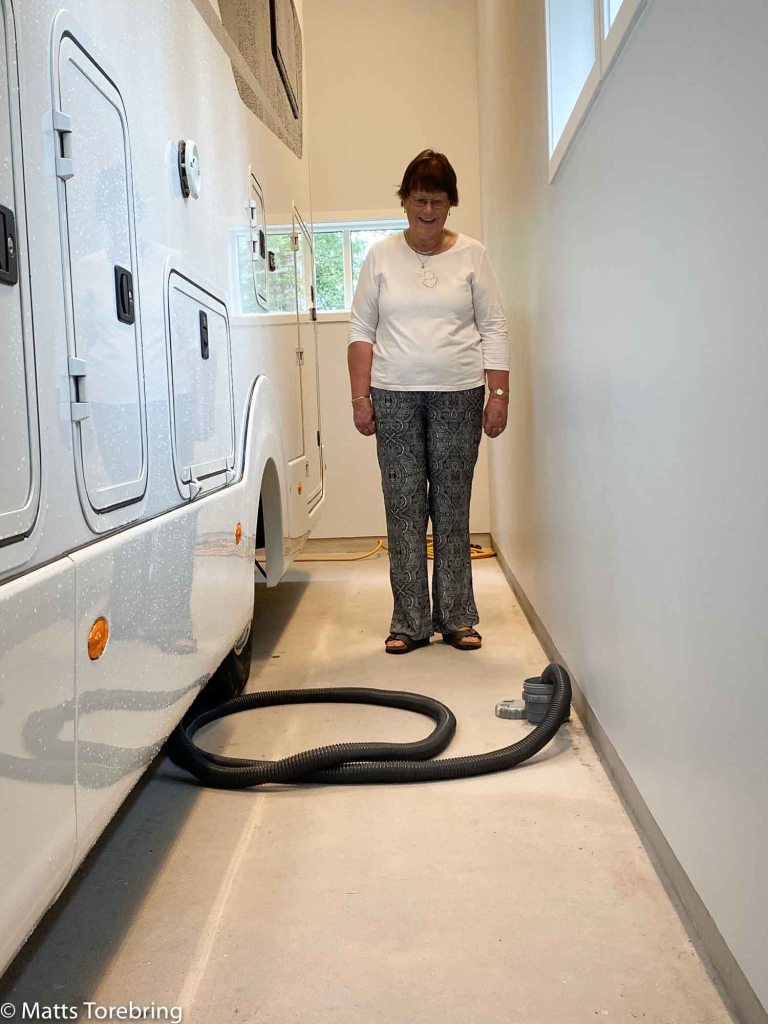 Nu har vi kommit hem och backat in HERDEN i sitt eget ”vardagsrum. (Det var vår målarmästare som döpte det till HERDENS vardagsrum). Vilken lyx vi har! För första gången kopplar vi på slangen till avloppet, för grå- & kiss & bajsvatten. Samtidigt kopplar vi på friskt vatten och spolar ur tankarna.