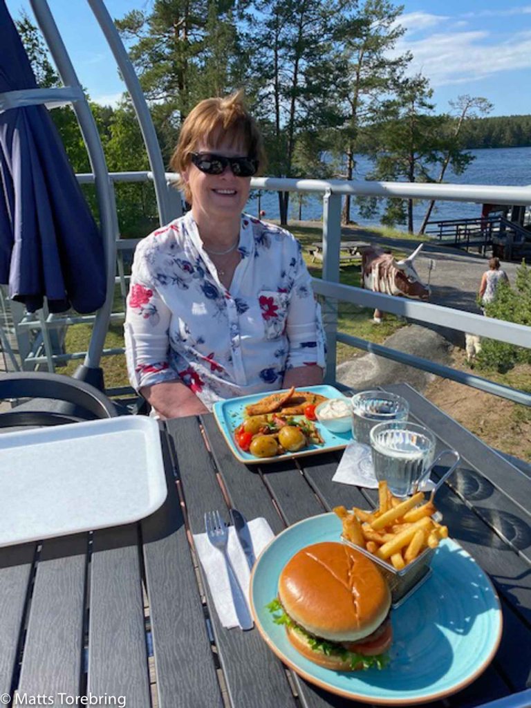 Vi passade på och tog en ”After Work” i restaurangen. Det blåste så dant, att de fulla vattenglasen, var nära att blåsa av brickan. Här uppe på soldäck, en trappa upp, var det dock ganska behagligt trots allt. Jag åt en speciellt sammansatt hamburgare av entrecote på 180 gr. Min pigga 71- åriga hustru, Birgitta, som inte heller äter någon medicin, åt en Sommen aborre tallrik.