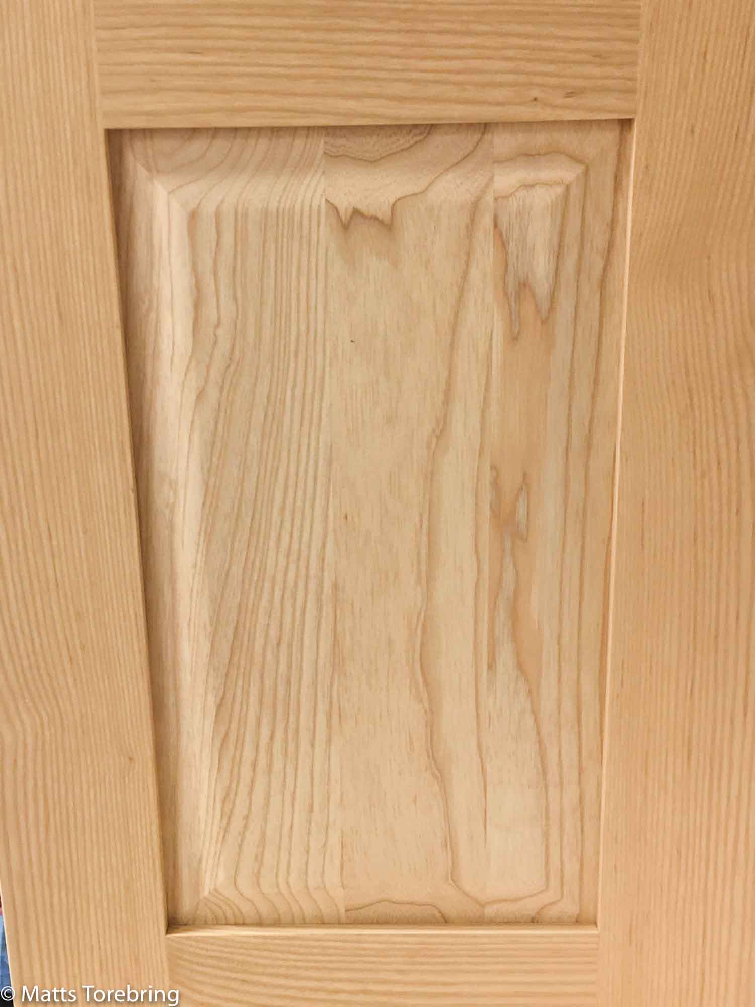 Vi hade med oss ett stycke stengolv, för att skapa harmoni och en estetiskt tilltalande miljö. Det enda vi visste var, att vi inte ville ha ha en målad MDF skiva. Vi ville ha massivt trä som det är, eller vitlackerad. När jag fick se denna lucka i massiv ask, var det kärlek vid första ögonkastet. Allt annat var passé. Så fantastiskt roligt och ett klockrent möte mot vårt stengolv.