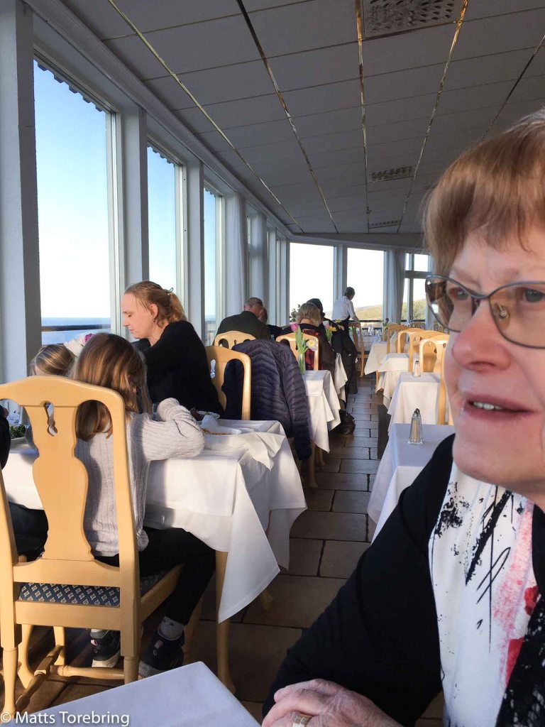 Birgitta hänförs av utsikten från restaurangen.